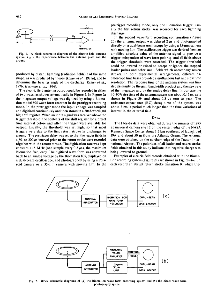 在佛罗里达州和亚利桑那州的电场中,天线都放置在接地研究的车辆顶上,车辆中还包含了天线电子和波形测量仪器。波形因子F是通过比较屋顶天线对遥远闪电的响应和装置在距离研究车辆50米远的第二个天线的响应来确定的。作为一致性检查,两个正交磁性天线系统[Krider和Noggle, 1975] 被用来验证远距离闪电(辐射场)产生的电场和磁场有同样的形状,正如Uman等人的理论预测的那样[Uman等人,1975a],同时确定放电的方位角[Krider等1976;Herrman等,1976].