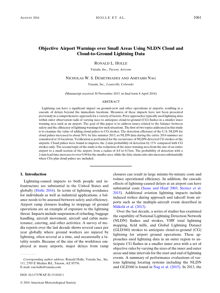 摘要:闪电会对地面人员和机场其他作业产生重大影响,导致超过直接位置的延迟级联。这些影响的措施尚未出台。先前的方法通常使用不同大小的外部观测半径内的闪电数据来预测较小的内部警告区域(例如机场)的云对地(CG)闪烁。本文的目的是解决有关平衡之间的问题。安全预警与应急效能的研究是检查增加云脉冲对CG脉冲过程的价值。美国在2013的夏末,NLDN的检测效率,云脉冲增加到约50%,因此2014年整个夏季的NLDN数据都是在10个地点考虑的。在机场发生NLDN检测到的CG冲程进行验证。机场2分钟内发现云脉冲的检测概率比CG提高13%。研究的重点是从整体上对内环境的影响。机场的一个小区域,从半径4.8到0.5公里。用A检测的概率提前2 分钟增加到90%以上,假证比例大幅增加。CGS加上云脉冲包括在内。