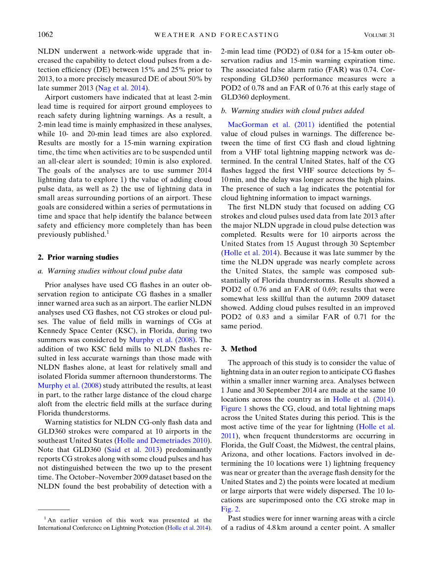 第一次NLDN的研究,重点是添加CG中风和云脉冲使用的数据从2013年底后,主要的NLDN升级在云脉冲检测完成。结果是美国的10个机场从8月15日到9月30日(霍利等。2014)。因为在整个美国NLDN升级几乎完成的时候是夏末,样本基本上是由佛罗里达州雷暴组成的。结果显示POD2为0.76,故障分析报告为0.69。结果低于2009年秋季的数据集。增加云脉冲导致改进POD2为0.83,相似的故障分析报告为0.71。
