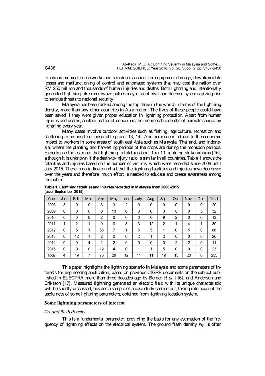 许多案例涉及户外活动,如在不安全或不适当的地方进行捕鱼,农业,娱乐和避难。另一个问题与东南亚一些地区如马来西亚,泰国和印度尼西亚的工人的经济影响有关,其中作物的种植和收获期在季风期。 专家使用估计雷电在约10%的雷击受害者中是致命的,虽然不知道死亡与伤害比在所有国家是否相似。 表1显示了根据自2008年至2015年7月期间记录的受害者人数而导致的死亡和受伤情况。根本没有迹象显示,多年来雷电致伤和伤害已经减少,因此仍然需要作出大量努力来教育和在公众中创造意识。