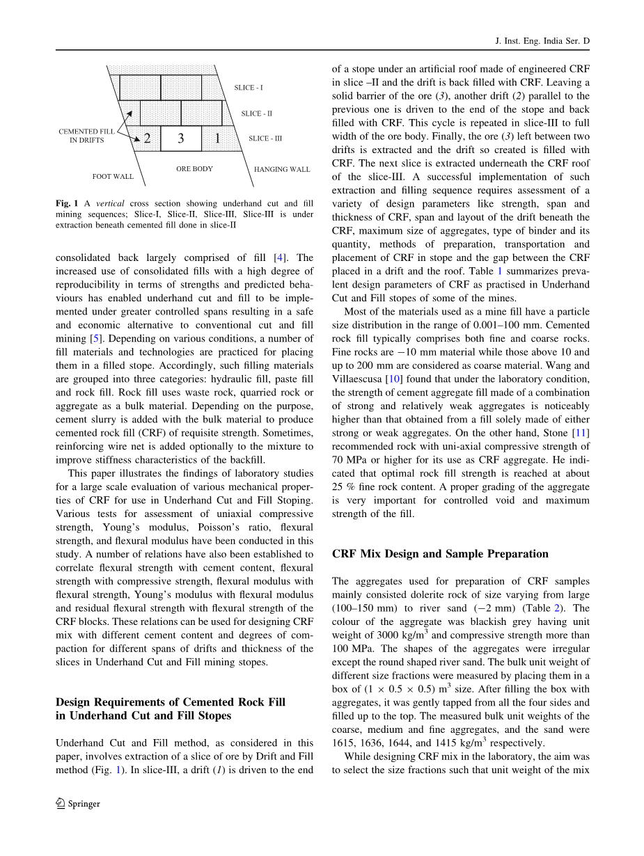 本文认为,地下充填采矿法涉及一片矿体矿脉提取和填充的方法(图1)。在第三层,矿脉(1)被驱动到一个在第二层设计的胶结岩石的顶板下的采场结束,并用胶结岩石回填。离开一个坚实的屏障的矿石(3),另一个矿脉(2)平行于前一个驱动和采场的充满了CRF。这个循环重复slice-III全部宽度的矿体。最后,两个矿脉之间留下的矿石(3)被提取,因此产生的矿脉填充有CRF。下一层是提取下面的slice-iii.成功提取和充填序列的实现需要各种力量的设计参数,评价CRF顶板,跨度和厚度的CRF、跨度和布局的矿脉在CRF,骨料的最大尺寸,粘结剂及其制备方法,数量型,运输和采场布置和CRF CRF的差距之间放置在矿脉和顶板。表1总结了CRF在一些地下充填采法的采场中的通用设计参数。