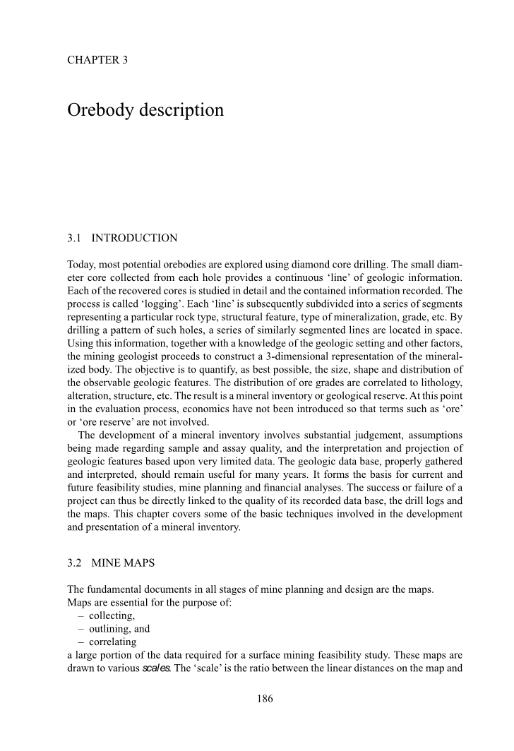 iso-grade轮廓线是一种不太经常使用的显示矿区等级的技术。虽然使用这种技术的原因有很多种,最主要的一个是在所考虑的例子中,实际上勘探的钻孔的方向是多种多样的。对于这个例子,使用Cherrier (1968)的方法和数据证明决定吨位和等级的技术的应用和完成矿井尾部纵剖面的应用。图3.36是一张显示矿体钻孔位置和地表地势的规划图。这种栅格系统是已经被迭代了的。在图3.37到3.41中,抛弃4、8、16和20部分。第2和22部分的钻孔显示没有矿体的存在。使用钻孔数据和沉积矿的知识可以创建品位轮廓线。矿坑的轮廓线可以使用第五章描述的步骤来开展。第五横切面可以看到纵剖面部分3200N沿着矿坑接近轴线。这部分见图3.42.建议岩石力学研究东边尾部的45°倾角和西边50°角。从这些钻孔可得,西边2到4之间的矿体和东边20到22之间的矿体必须终止。等级轮廓线用来描述图3.43中的这种情况。检查代表最终矿坑的规划(图3.44),