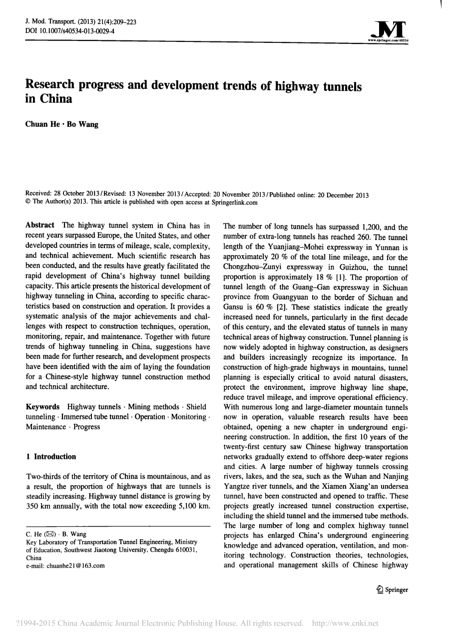长、大直径深埋公路隧道施工,并常常伴有如岩爆、大变形等地质灾害,以及其他问题。研究的硒和相关问题提供了许多见解。例如,对岩爆的形成机理,研究预测技术,和预防措施在二郎山了钕苍岭特长公路项目。研究分析了初始支护时间岩爆条件下,成功地进行了二次反分析的初始应力场基于岩石破裂破坏标志的后续岩石破裂预测在田野里。该研究为公路隧道岩爆预测[15-17]的进一步研究提供了新的思路和方法。此外,在中国西部经济的发展提出了一个我日益严重的公路隧道千枚岩等软岩大变形问题,直到现在还没有有效的研究提供了技术支持。在以往的研究中,强支持用于控制变形[ 18 ],和支护参数通常超过“规范推荐值为公路隧道设计。”然而,强有力的支持,有时是不够的TO控制大变形的应力,锚弹,钢拱不失真,和初始衬砌开裂发生。传统的支护方法和技术面临巨大的挑战的挑战日益复杂的项目,并支持移植系统基于新材料和新技术的需要。此外,在高海拔地区的隧道施工需要考虑防冻液因素。由西南交通大学应用液固热耦合分析公路隧道在高抗冰冻设计技术何川教授的团队—高度区域。他们研究了鹧鸪山隧道,在防霜的材料放在二次衬砌表面绝缘(图2)。这项研究改变防冻设计公路隧道在寒冷、高海拔地区,成功地应用于子序列。隧道的进一步提高公路隧道建设的高度限制了NE抗霜技术的挑战。