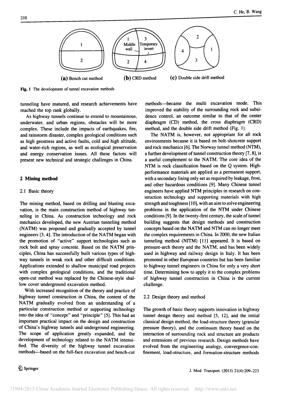 新奥法,但不适合所有的环境,因为它是基于岩石锚喷支护及岩石力学[。挪威隧道法,隧道公司的进一步发展理论,是新奥法的有益补充。对挪威隧道法的核心思想是基于Q系统围岩分类。高性能材料被用作永久性的支撑物第二次衬砌仅设置为所需的泄漏,霜冻和其他危险条件。许多中国工程师在隧道施工技术研究应用控制的原则和非结核分枝杆菌支持材料具有较高的强度和韧性,以解决在中国条件下的挪威隧道法的工程应用问题。在第二十一世纪,规模隧道建设提出的设计方法和建设基于新奥法和挪威隧道法的概念已不能适应中国复杂的要求。意大利新隧道法,中国测试技术研究院出现了。它是基于压力拱理论和新奥法,已广泛应用于公路、铁路设计在意大利。它已在其他欧洲国家被推进,已有熟悉的隧道工程师,但在中国非常短时间。确定如何将其应用于我国公路隧道施工中的复杂问题,是当前面临的挑战。