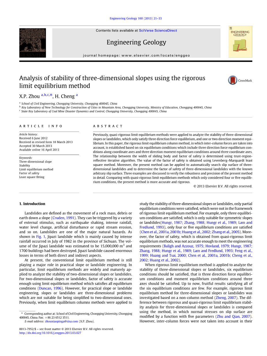 目前,常规的极限平衡方法在实际的斜坡或滑坡工程仍然发挥了重要作用。特别是,极限平衡方法被广泛和成熟应用于分析二维斜坡和山体滑坡的稳定性。对于二维边坡或滑坡,使用满足所有平衡条件的极限平衡方得到的安全系数是足够精确的(邓肯,1996)。然而,对于实际的边坡或滑坡工程,斜坡或滑坡是三维问题,不适合被简化为二维的。以前,应用极限平衡法对三维边坡或滑坡稳定性进行了研究,仅对部分平衡条件进行了满足,而不是在严格极限平衡法的框架下进行的。例如,只有三种平衡条件都满足,这仅适用于对称斜坡和滑坡(Hungr,1987;Zhang,1988;Hungr等人,1989;Lam和Fredlund,1993),只有四五个平衡条件得到满足(Chenetal,2001a,2001b;Huangetal,2002;Zhangetal,2005)。此外,从准严格限制平衡法获得的安全系数,是不能完全满足工程要求的(Baligh和Azzouz,1975,Hovland,1979; Hungr,1987;zhang,1988; Hungr等人,1989; Lam和Fredlund,1993; Feng等,1999; Huang 和Tsai,2000;cheng等人,2001a,2001b。 Cheng等人,2002; Huang等人,2002)。