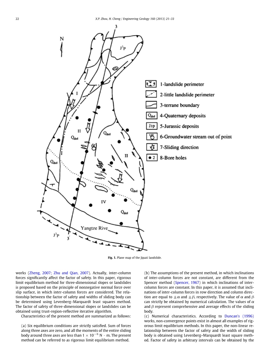 当用严格极限平衡法分析三维斜坡和山体滑坡的稳定性,六个平衡条件都应该得到满足,即三维数轴上三个方向的力平衡条件和力矩平衡条件都满足。到现在为止,满足所有的六个平衡条件的丰硕的成果却很少。例如,基于非柱法研究三维边坡或滑坡的极限平衡法。(郑2007)。三维斜坡或滑坡的严格与准严格极限平衡稳定性分析的区别在于使用方法,其中在滑动面正应力由五个参数的函数修正。(Zhu 和 Qian, 2007)。然而,在他们的工程中没有考虑到柱间的作用(Zheng, 2007; Zhu 和 Qian, 2007)。实际上,柱间的作用明显影响着安全系数。本文基于非负法向力原理,提出了三维边坡或滑坡的严格极限平衡法,并在此基础上考虑了桩间的相互作用。滑动体的安全系数与宽度的关系采用最小二乘法确定,滑坡三维边坡安全系数也可以使用信任域反射迭代算法得到。本方法的特点总结如下: