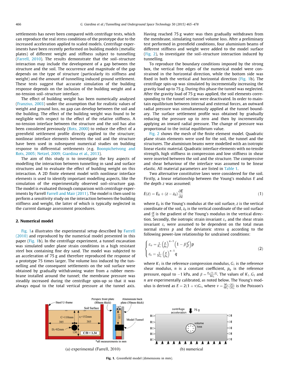 然而,很少数值模拟研究已经证实实验结果; 特别是,埋有隧道的居民点的土壤—地面结构的相互作用的计算模型从来没有过的离心试验相比,其中它可以重现真实的在加速应用的缩放模型条件下的应力原型。最近离心机实验在不同的重量和刚度主体建筑模型(金属板)的隧道上进行。结果表明,土层-地面结构相互作用也许包括的结构和土壤之间的间隙发展。间隙的发生和大小取决于结构的类型(特别是它的刚度和重量)和隧穿引起的地面沉降的量。这些试验表明,对建筑物精确模拟的响应取决于建筑物的重量和无张力土结构的界面。