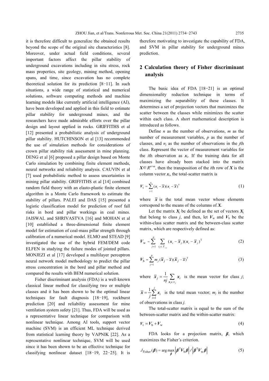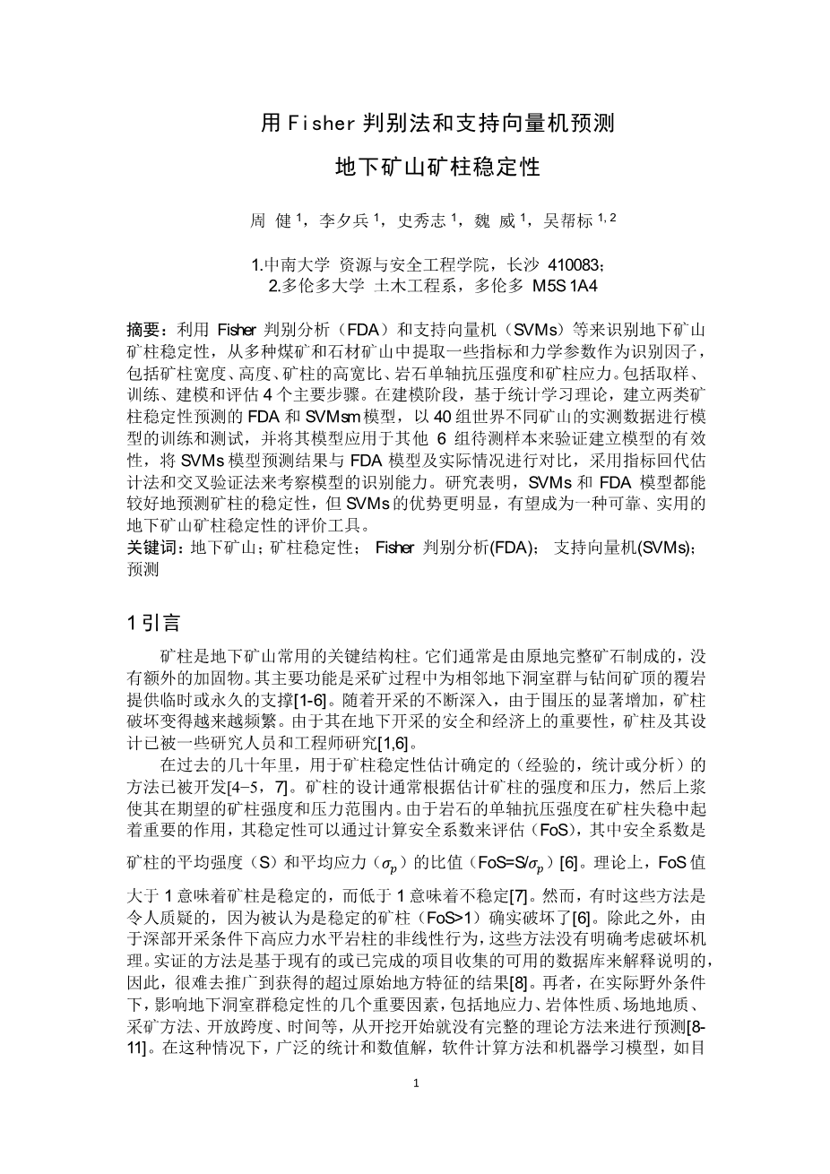 用Fisher判别法和支持向量机预测 地下矿山矿柱稳定性外文翻译资料