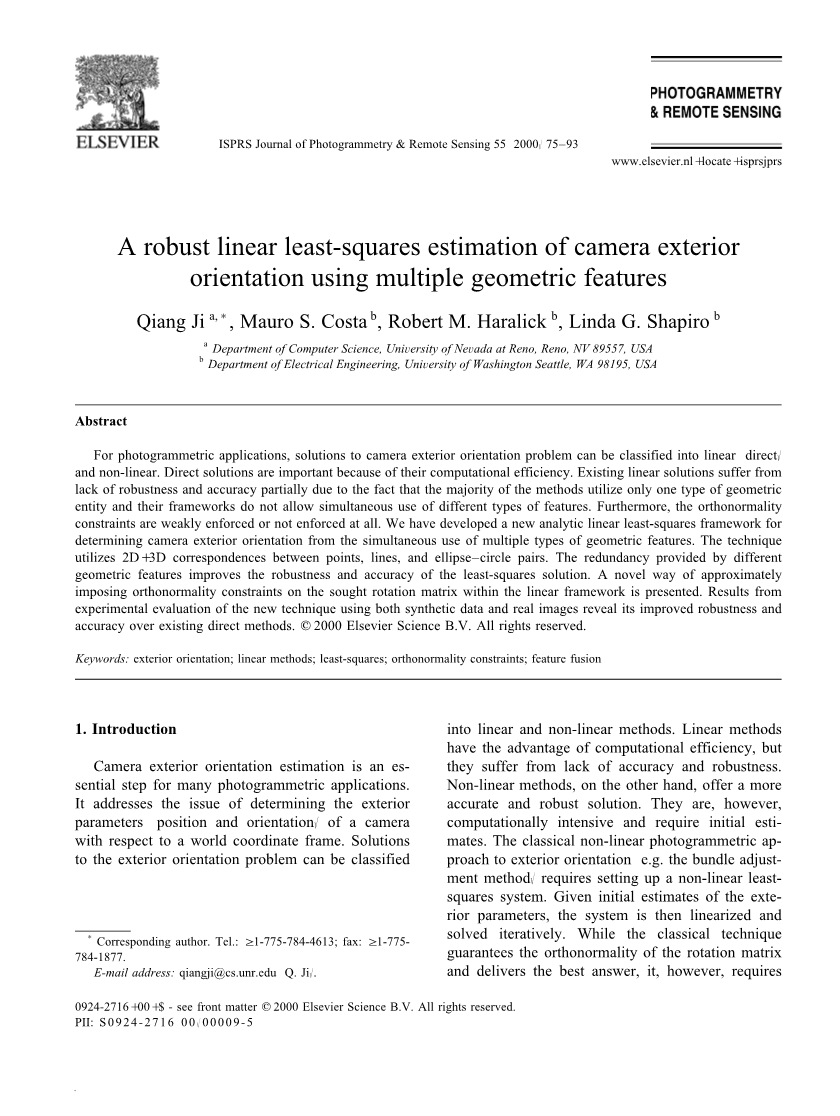 基于多几何特征的摄像机外方位鲁棒线性最小二乘估计外文翻译资料