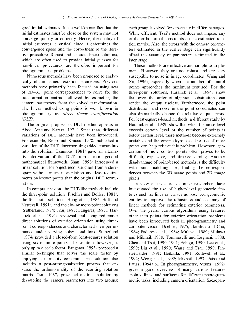 鉴于这些问题,其他研究人员已经研究了高级几何特征的使用,例如观察到的几何形状的线或曲线实体以提高的鲁棒性和准确性估计外部参数的线性方法。多年来,使用特征的各种算法除了用于外部定向问题的点之外,已在摄影测量和计算机视觉被引进(杜勒县,1975年;哈拉利克和楚·日,1984年;帕德雷斯等人,1984年;穆拉瓦,1989年;穆拉瓦和米哈伊尔,1988年;通马塞利和卢格纳尼,1988年;陈和蔡,1990,1991;志高,1990年;李等人,1990年;刘等人,1990年;王和仔,1990;芬斯特瓦尔德,1991年;海基拉,1991年;罗斯韦尔等人,1992年;翁等人,1992年;米哈伊尔,1993年;佩特萨和帕蒂亚斯,1994年)。在摄影测量领域,斯特伦茨(1992年)提供了一个很好的概述,可以使用不同的特征(点、线和曲面)来完成不同摄影测量任务,包括摄影机方向。什切潘斯基(1958年)审查了近60种不同的空间切除的解决办法,追溯到1829年,用于同时和单独地确定位置和旋转参数。托马斯利和图兹(1996年)描述了一种利用直线特征进行空间后方交会的迭代卡尔曼滤波方法。马斯里(1981年)描述了一种利用线性特征进行相机绝对定向的方法,卢格纳尼(1980年)描述了通过空间切除进行相机外部定向的方法。德雷沃克和卢赫尔(1997年)提出了一种基于检测和定位平面物体人孔盖板的航空图像自动外部定向方法。乙烯利(1984年)使用平行和垂直的物体线来估计非测量相机的旋转和内部取向。