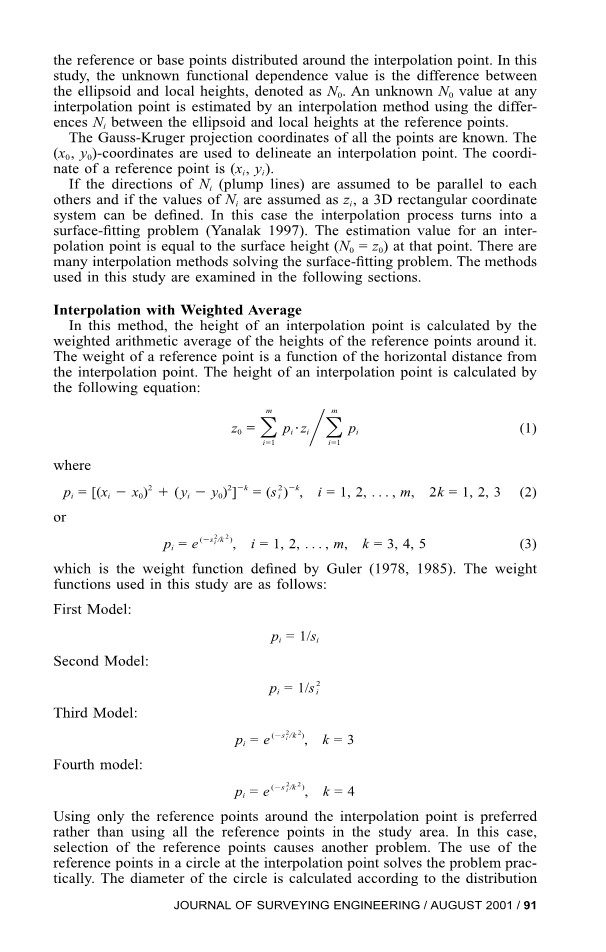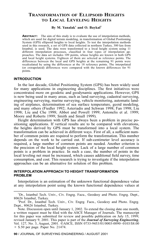 摘要:本研究的目的是评价插值方法的应用,一种用于数字地形建模在全球定位系统(GPS)椭球高度向局部高程的转换。为了测试本研究中使用的插值方法,使用了在距伊斯坦布尔300公里的土耳其北部收集的一组GPS数据。利用11个不同的插值过程,将数据转换为一个局部高程系统,分为四类插值过程。该数据集包括109个点,它们的高度在GPS和本地高度系统中都是已知的。其中18个被选为参照点。通过在18个参考点上的差异,重新计算了在其余91个点上的局部和GPS高度之间的差异。对91个点的内插(或外推)差与已知差进行了比较。