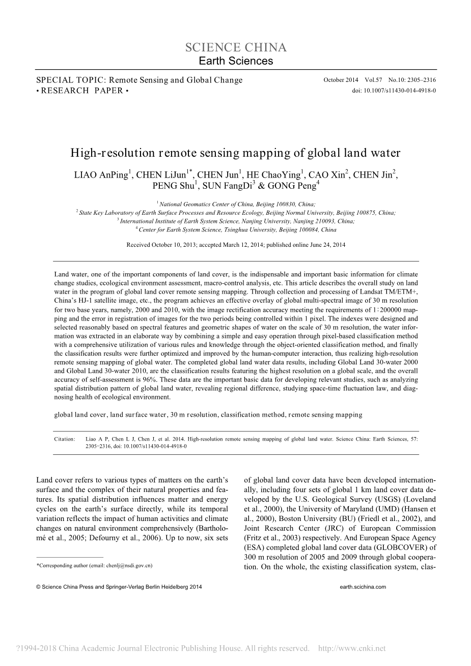 土地覆盖是指地球上的各种事物表面和它们的天然特性和特征的复合物功能。其空间分布影响物质和能量直接在地球表面循环,而在地球表面循环变化反映了人类活动和气候的影响全面改变自然环境(Bartholo-meacute;等人,2005; Defourny等,2006)。到目前为止,国际上已发展了六套全球土地覆盖数据,其中包括四套全球1公里的土地覆盖数据,受美国地质调查局(USGS)(拉夫兰地区)的支持2000),马里兰大学(UMD)(Hansen等人,2000),波士顿大学(BU)(Friedl等,2002)和欧盟委员会联合研究中心(JRC)(Fritz等,2003)。和欧洲航天局(ESA)完成了全球土地覆盖数据(GLOBCOVER)2005年和2009年通过全球合作。整体而言,现有的分类系统,分类精度,更新频率等为6套全球土地覆盖数据产品无法满足需求全球变化研究和地球系统模型。除此之外,全球土地覆盖数据发展空间和空间较高时间解决方案将成为国际议程。它在“北京宣言”中明确提出地球观测组织(GEO)全体会议认为全球高空间分辨率的土地覆盖数据产品通过合作和发展来发展已纳入GEO 2012-2015工作计划。中国启动了国家“863”重大计划“全球土地”覆盖遥感地图和关键技术重新设计,搜索“,其中主要研究任务是使用具有空间分辨率的多光谱遥感影像30米进行十大主要遥感测绘类型如陆地水,湿地,人造草地,农田,林地,草地,灌木等2000年和2000年基准年并开发全球土地覆盖数据产品这两个时期的分辨率为30米。