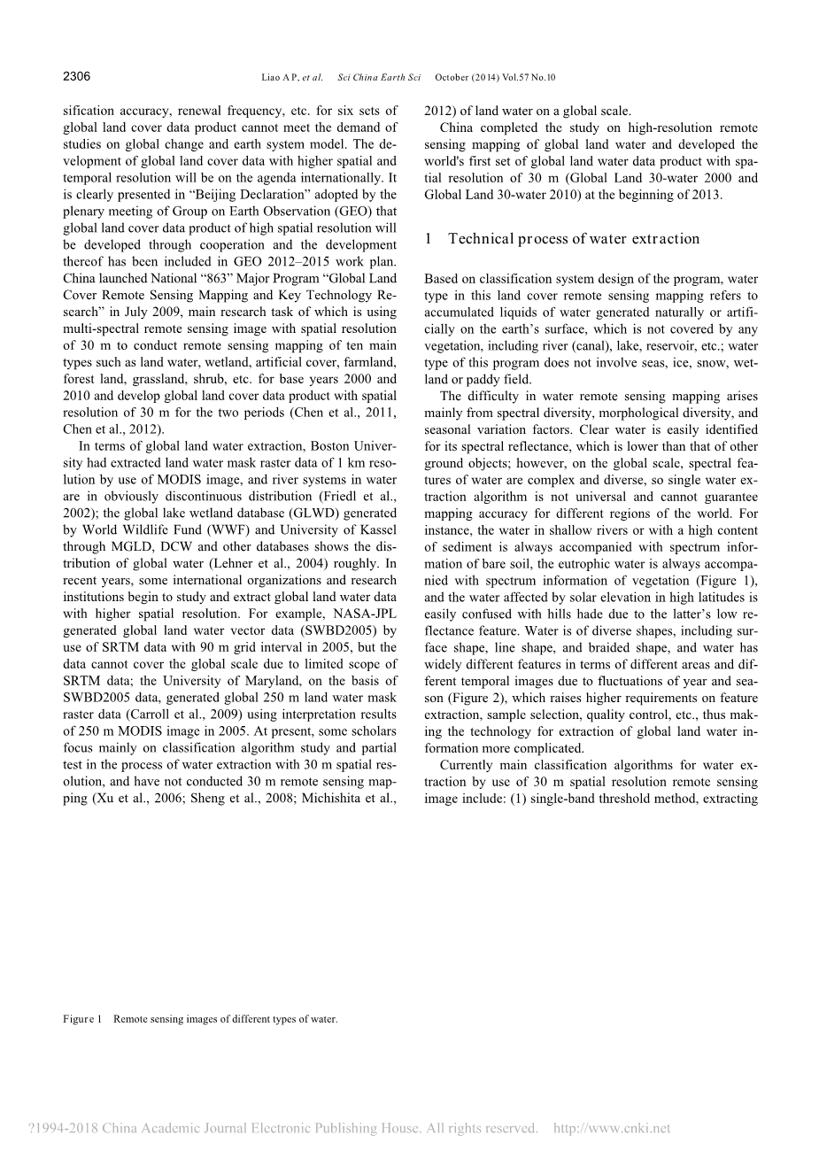 就全球陆地水资源开采而言,波士顿大学 - sity提取了1公里reso-通过使用MODIS图像和水系中的河流系统显然是不连续分布的(Friedl等,2002);生成全球湖泊湿地数据库(GLWD)由世界野生动物基金会(WWF)和卡塞尔大学提供通过MGLD,DCW和其他数据库显示,对全球水资源的贡献(Lehner等,2004)。在近年来,一些国际组织和研究各机构开始研究并提取全球陆地水资源数据空间分辨率更高。例如,NASA-JPL生成全球陆地水矢量数据(SWBD2005)2005年使用90米电网间隔的SRTM数据,但是由于范围有限,数据无法覆盖全球范围SRTM数据;在马里兰大学的基础上SWBD2005数据,生成全球250米的陆地水面膜栅格数据(Carroll等,2009)使用解释结果2005年的250米MODIS影像。目前有学者主要集中在分类算法研究和部分在30 m空间分辨率的水萃取过程中进行试验,并没有进行30米遥感地图 - 在全球范围内开展了全球范围内的陆地水资源评估(Xu等,2006; Sheng等,2008; Michishit等,2012)。中国完成了高分辨率遥控研究感知全球陆地水域的绘图并开发出了这个地图世界上第一套全球土地水资源数据产品,小时分辨率为30米(Global Land 30-water 2000和2000Global Land 30-water 2010)。