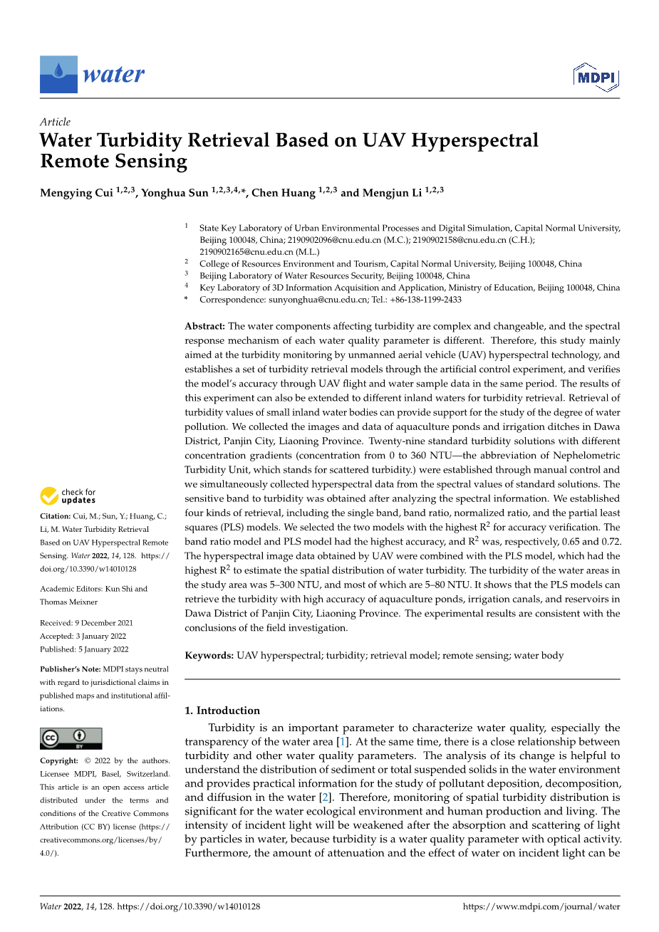 基于无人机高光谱遥感的水体浊度反演外文翻译资料