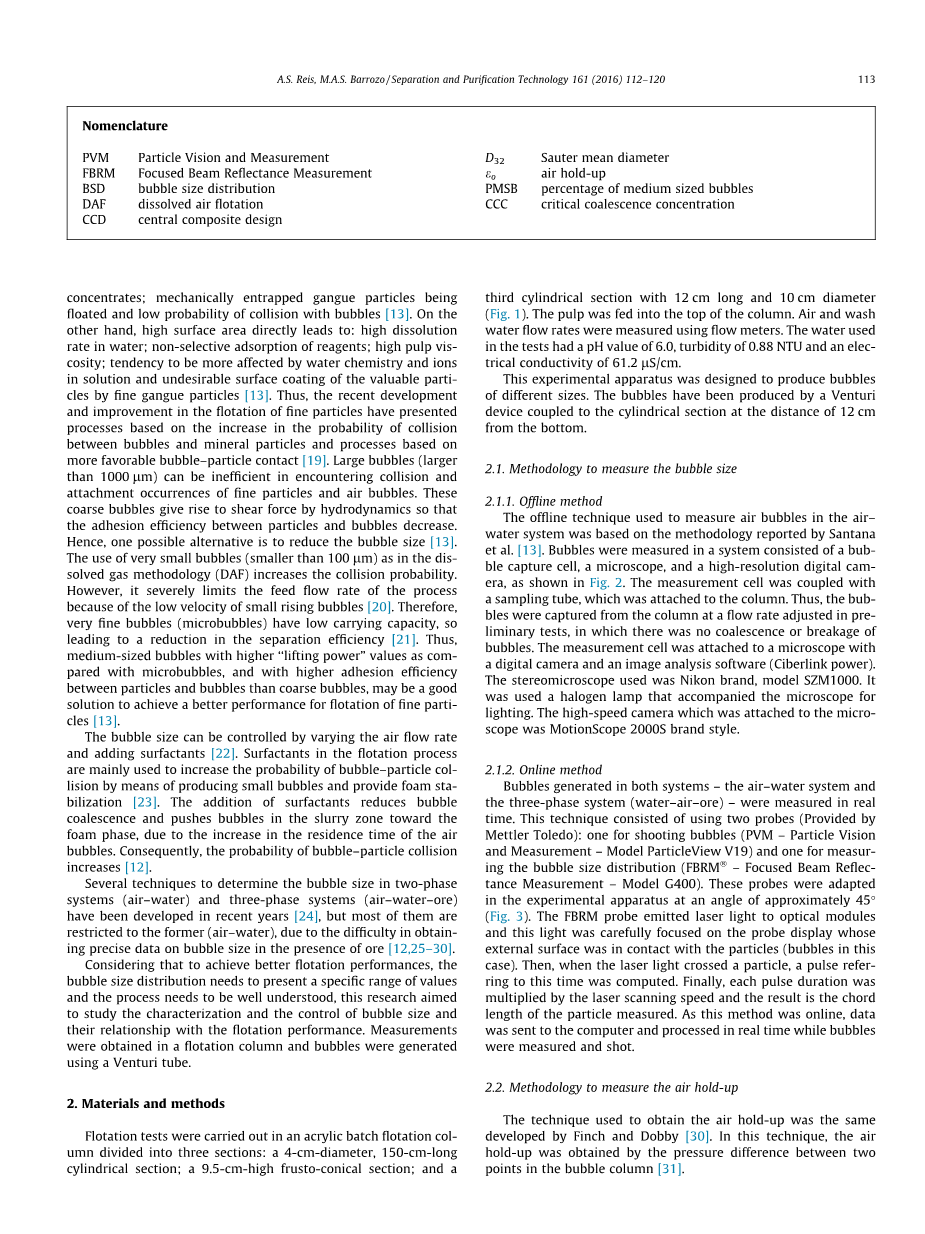 考虑到实现更好的浮选性能,气泡大小分布需要特定范围的值,这个过程需要很好的理解,这项研究的目的是研究气泡尺寸的表征与控制它们与浮选性能的关系。使用文丘里管测量在浮选柱获得并产生的气泡。