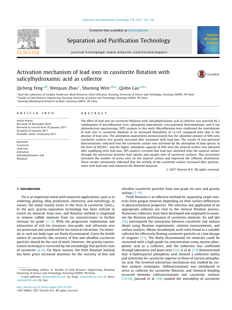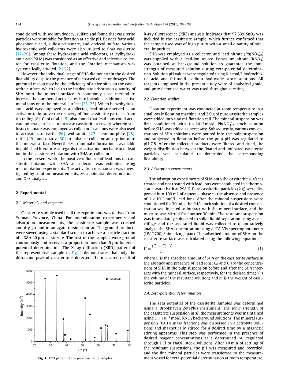在本次工作中,使用微浮选实验发现SHA作为捕收剂铅离子对锡石浮选的有积极影响。通过溶液测量,zeta;电位测定和XPS分析研究了活化机制。