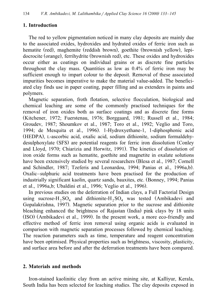 在以往的deferration研究印度黏土中,全因子设计使用sucrose-H2SO4和dithionite-H2SO4测试(ambikadevi和gopalakrishna,1997)。磁选分离前蔗糖和连二亚硫酸盐漂白增强Rajastan(印度)粉色黏土的白度,为18个单位(ISO)(ambikadevi等人,1999)。在目前的工作中,一个更环保和更有效的方法,是先使用有机酸去除铁,再通过磁选,然后进行化学浸出。对反应参数,如时间、温度和试剂浓度进行了优化。物理性能如白度、黏度、可塑性与deferration处理前后进行比较。
