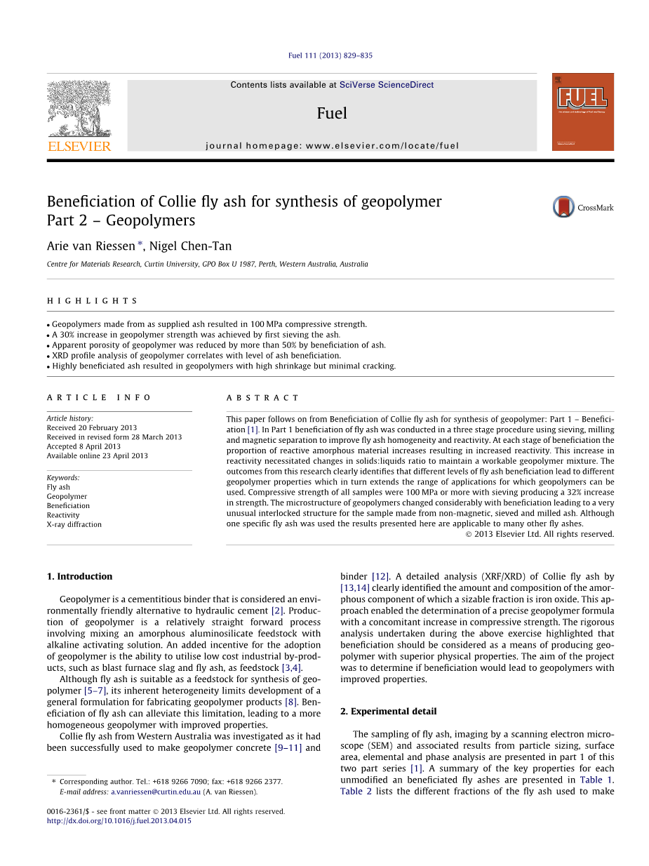 来自西澳洲的科利的粉煤灰经研究已成功用于制造地聚物混凝土[9-11]和粘结剂[12]。科利粉煤灰的详细分析报告(XRF/XRD)[13,14]清晰地鉴定出非晶形成分的数量和组成,其中相当大一部分是氧化铁。通过抗压强度的增加使得精确的测定地聚物成分成为可能。上述过程中严谨的分析表明预处理过程是一种生产具有优越物理性能的地聚物的方法。本研究的目的是确定预处理能否提高地聚物的性能。