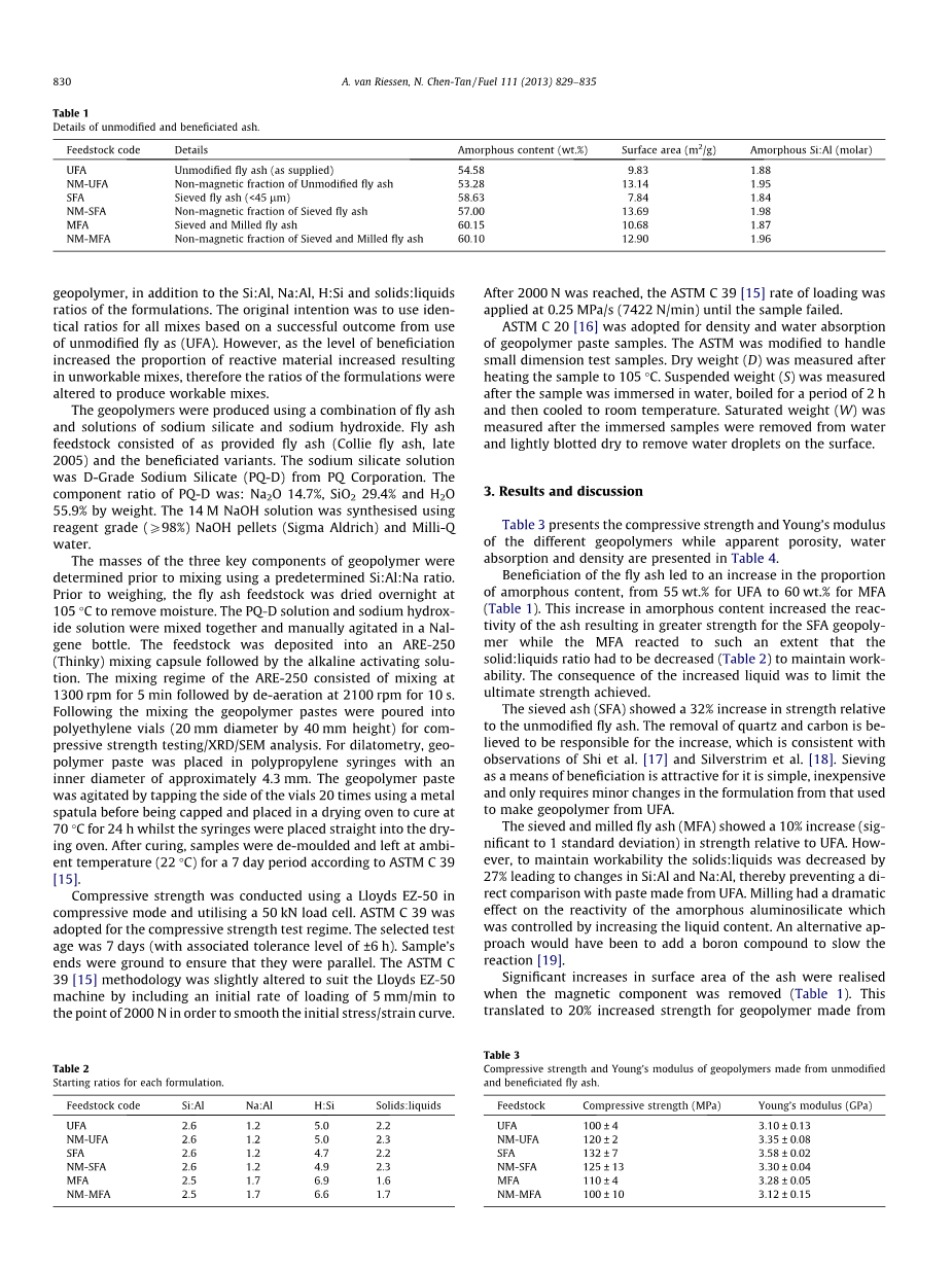 对粉煤灰的预处理导致了非晶形含量从UFA的55 wt.%增加到MFA的60 wt.%(表1)。非晶形含量的增加也使灰分的反应活性增强,这导致了SFA地聚物的强度更高,而MFA反应到这样的程度以致必须降低固液比(表2)来保持可加工性。增加液体的后果是限制了可以达到的极限强度。