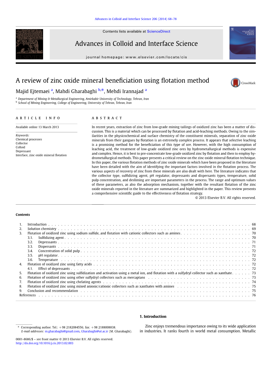 关键词:化学过程、捕收剂、胶体、抑制剂、氧化锌矿物表面浮选