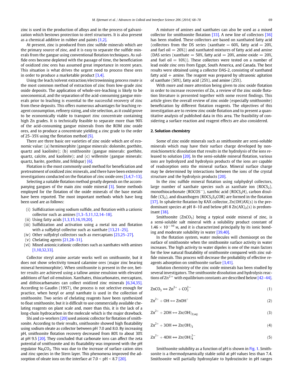为了提高锌的回收率,再加上一些最近的研究结果,氧化锌浮选受到越来越多的关注。本文的目的是综述氧化锌(特别是菱锌矿)在不同浮选试剂条件下的分选情况,并对该领域公布的数据进行定量分析。同时,浮选过程中表面反应和一些试剂的效果也做了讨论。