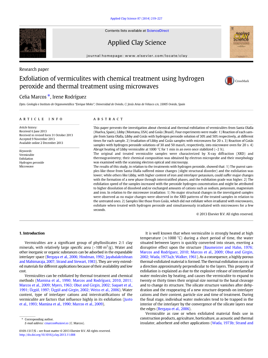当蛭石被发现做为原料或膨胀材料使用于建筑产品、农业、园艺、声学、热绝缘体、吸附剂和其他应用程序中时,利用过氧化氢的化学程序已被应用于脱落或化学活化2:1型粘土矿物。采用化学活化天然蛭石作为描述多孔材料的制备。我们研究了在20 C和80°C间以30%的H2O2溶液反应蛭石,也研究了金云母石和蛭石被剥离成相同大小的薄片(厘米级)在不同的H2O2浓度(1–50%)在不同时长(1–30 h)中的反应。一些学者发现蛭石的XRD部分在H2O2溶液作用下并没有变化,然而其他的一些人却报告有变化。