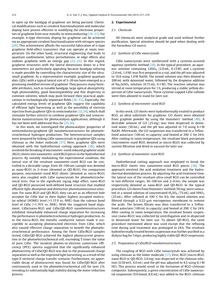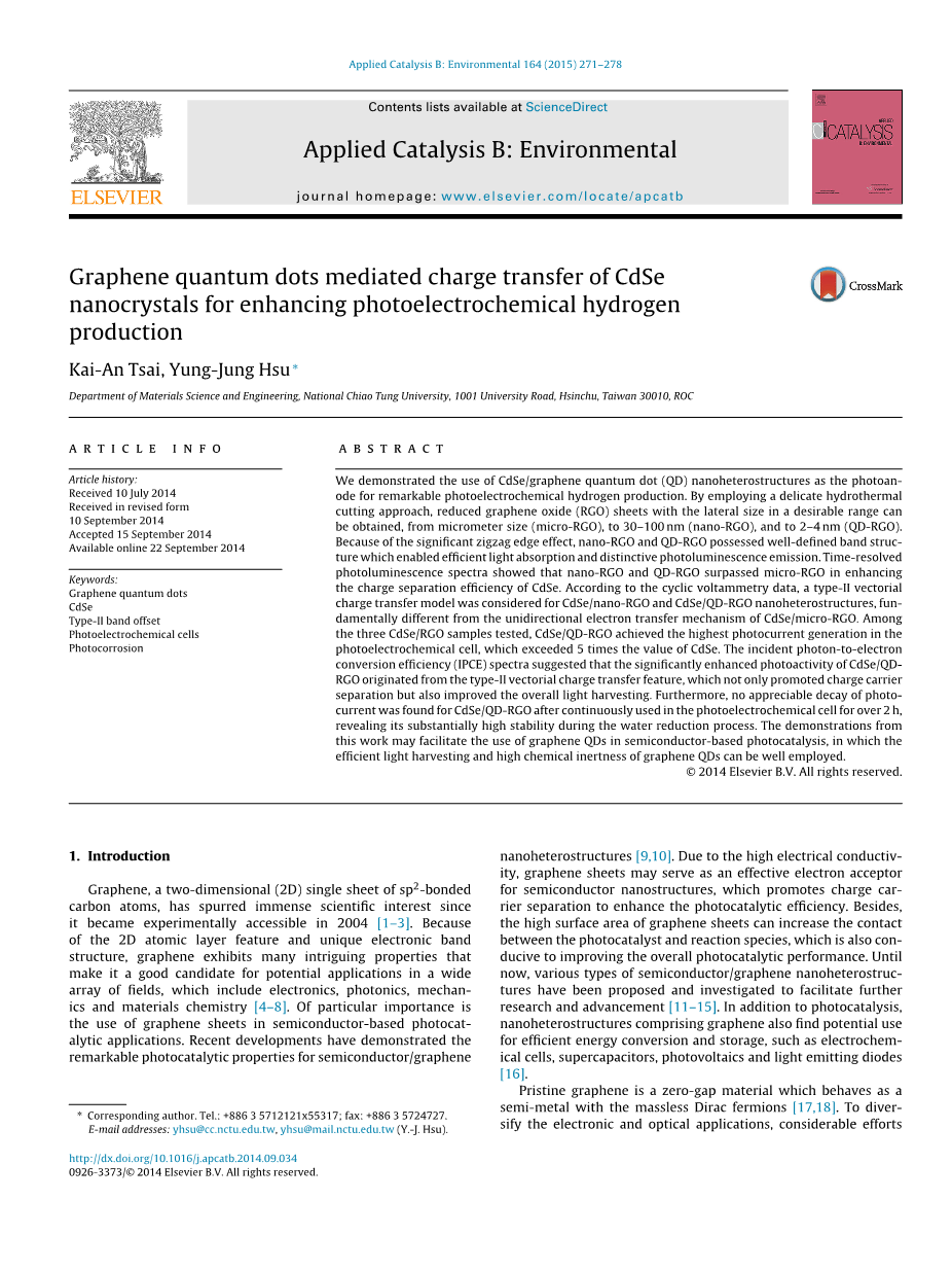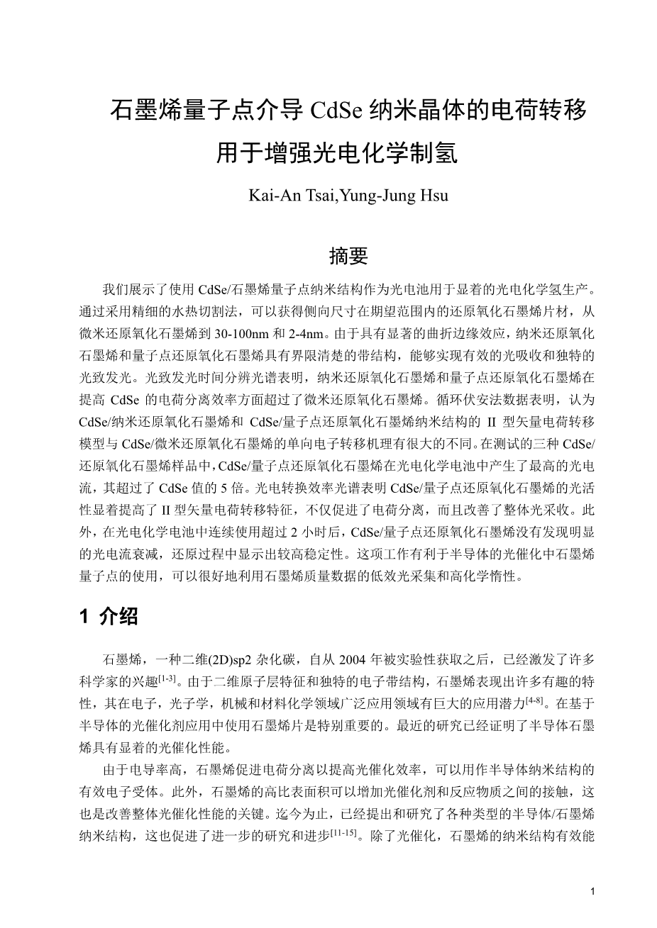 石墨烯量子点介导CdSe纳米晶体的电荷转移 用于增强光电化学制氢外文翻译资料
