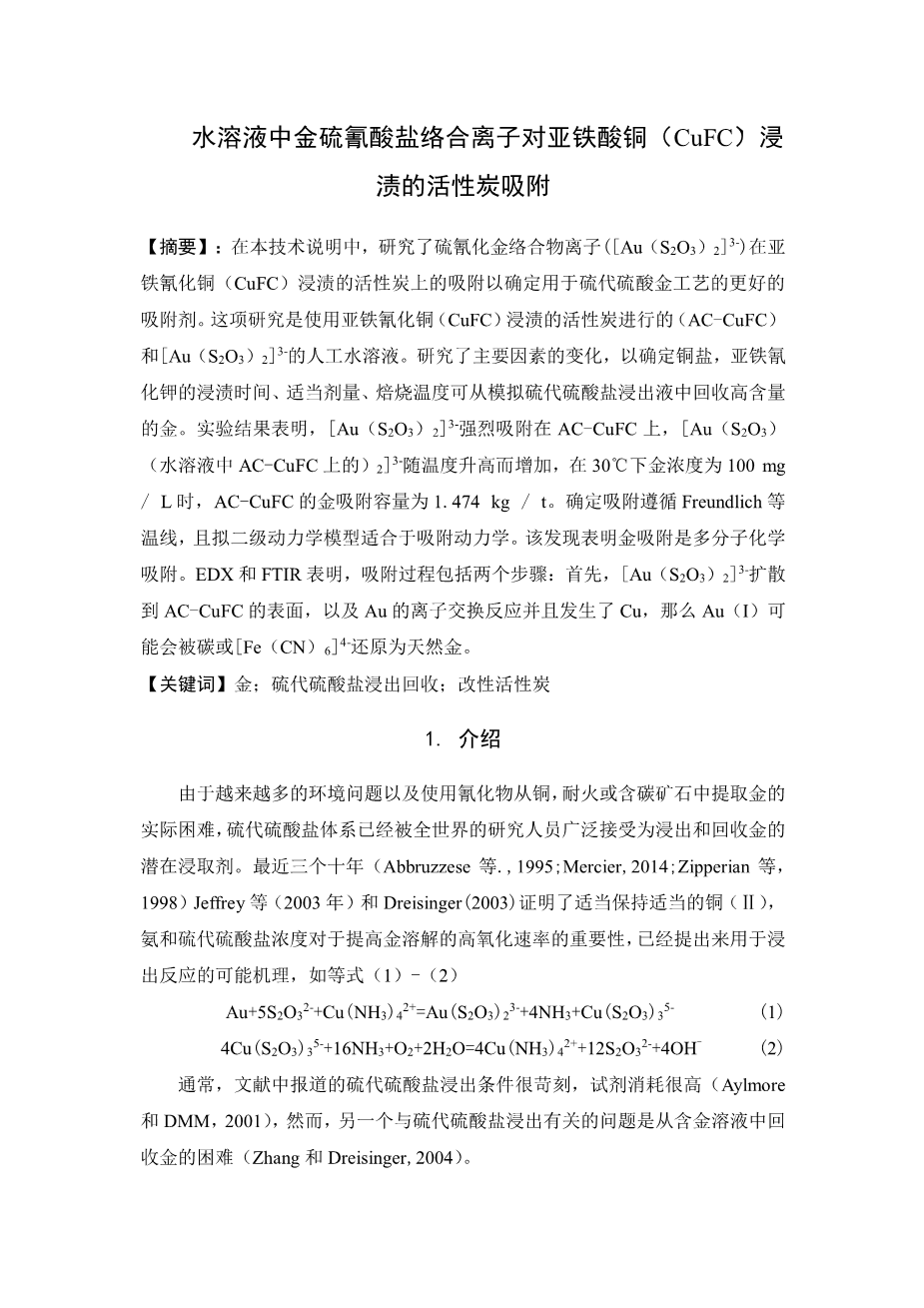 水溶液中金硫氰酸盐络合离子对亚铁酸铜(CuFC) 浸 渍的活性炭吸附外文翻译资料