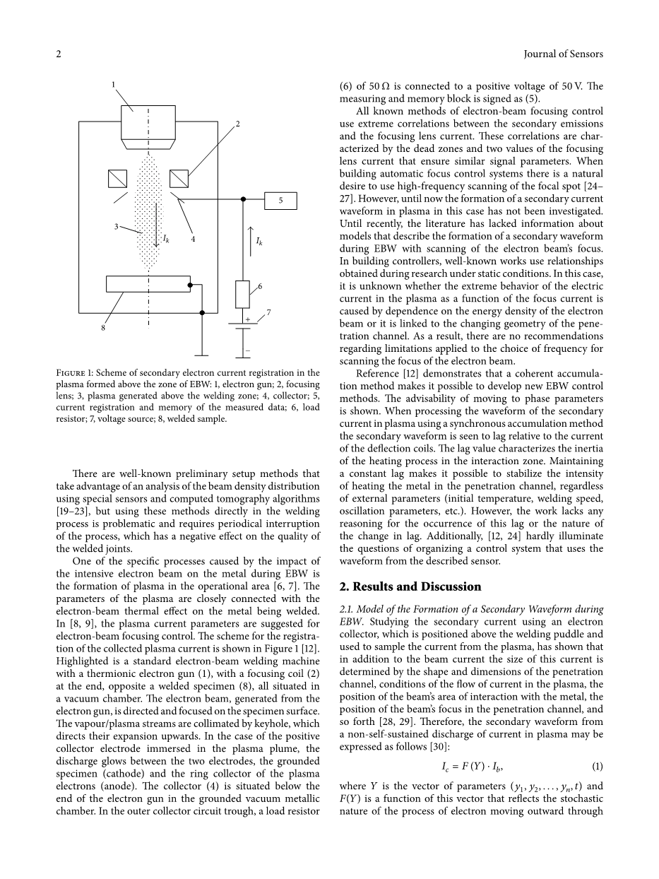 2.1。 EBW期间二次波形的形成模型。使用位于焊接熔池上方并用于从等离子体中采样电流的电子收集器研究二次电流,表明除了电子束电流之外,该电流的大小由穿透的形状和尺寸决定。通道,等离子体中电流流动的条件,光束与金属相互作用区域的位置,光束在穿透通道中的焦点位置等等[28,29]。因此,二次波形来自