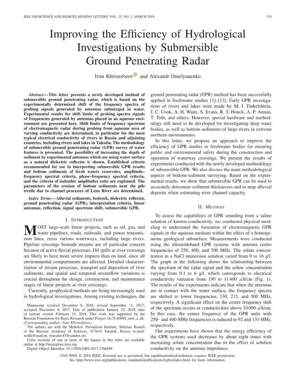 摘要—本文提出了一种新开发的潜水探地雷达方法,该方法基于实验确定的浸没在水中的天线所产生的探测信号频谱的偏移。本文根据放置在水环境中的天线所产生频率的探测频谱信号的位移极限的实验结果,确定了电磁雷达从电导率变化的水域进行探测时频谱的移动极限,尤其是对于俄罗斯和邻国河流(包括雅库特的河流和湖泊)最典型的电导率,并提出了潜水式探地雷(GPR)水特征调查的方法。实验表明,利用水表面作为天然介电反射器,可以提高沉积深度。本文解释了用于解释潜水探地雷达GPR结果和底部沉积物的既定标准,振幅-频谱标准,相位-频谱标准以及等压振幅比标准,并确定了丽娜河河道作用下桩架附近底质侵蚀的参数。
