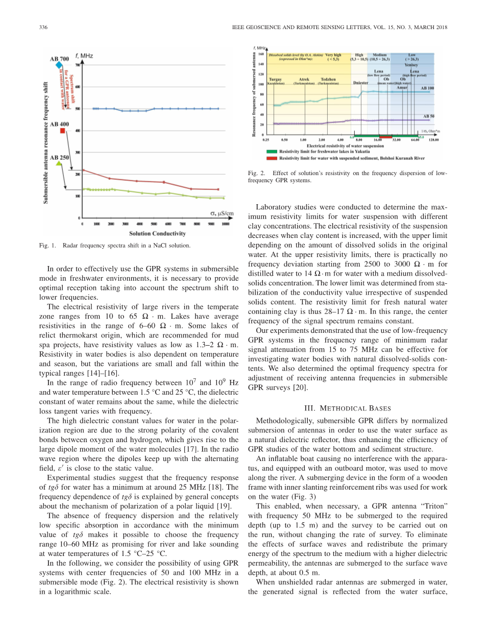 我们的实验证明,在15-75 MHz的频率范围内,使用低频的GPR系统可以有效地研究含有自然溶解固体成分的水体。我们还确定了潜水式GPR的接收天线频率调整的最佳频谱[20]。