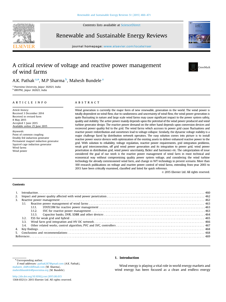 摘要:风力发电是目前世界上新的可再生能源发电的主要形式。风力发电完全依赖于气流,由于气流的随机性和不确定性,风力发电在性质上是相当波动的,而且大型风电场可能对电力系统的安全、质量和稳定性造成重大影响。有功功率主要取决于风力发电的潜力和风力发电机的设计。另一方面,无功需求取决于转换装置和馈送给电网的电能质量。接入电网的风电场会引起波动和无功再分配,有时会导致电压崩溃。同样,动态电压稳定是配电网运营商面临的一大挑战。简单的解决方案是安装无功电源设备,优化现有资产,以提供增强的无功功率到电网。解决可靠性、电压调节、无功要求、电网集成问题、弱网互联、离网风力发电及其与电网的集成、风电在配电网中的渗透、风电不确定性、闪烁和谐波等问题。考虑到我们工作的目标,问题的分类是在不影响高质量电力系统电压的情况下,以最优技术和最经济的方式对风电场进行无功管理,并考虑到已经委托的风电场的风力涡轮机技术,以及在目前情况下WT技术的变化。从2003年到2013年, 100多份关于风电场电压和无功控制的研究出版物得到了严格的审查、分类和列出,以供快速参考。