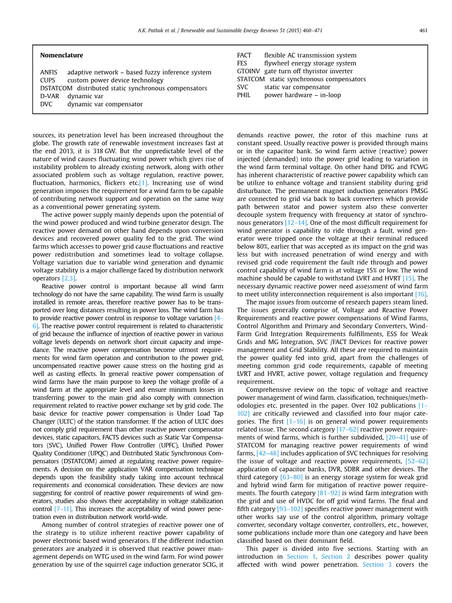 本文分为五个部分。从第1节的导言开始。第2节描述了受风力发电渗透影响的电能质量。第3节涵盖风电场各部分对无功功率的要求。第4节介绍了风电场无功需求的分割、电压和无功管理的各种技术和关键发现。最后,结论和建议载于第5节。