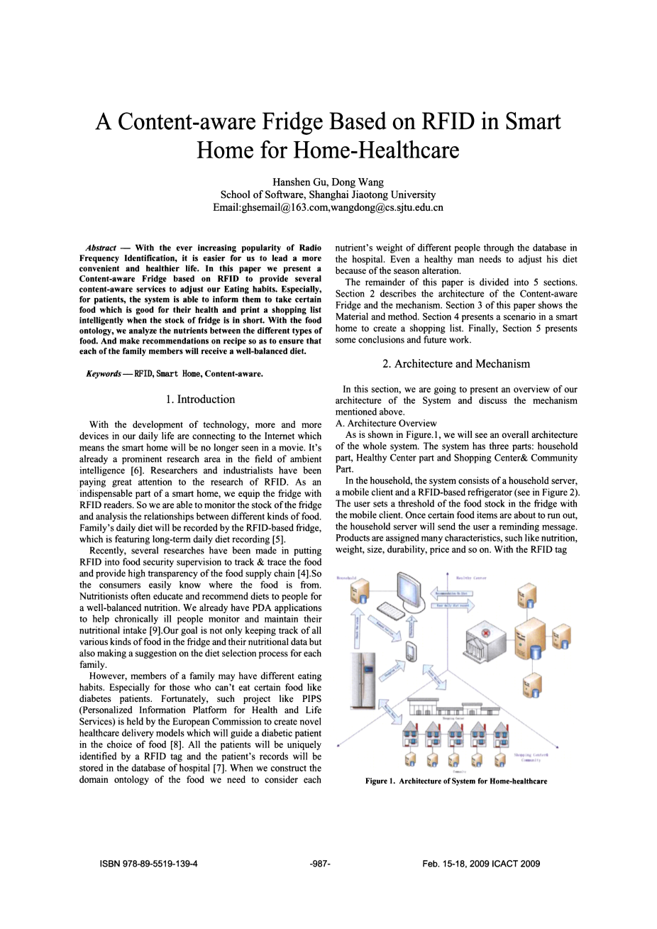 最近,IT行业最重要的趋势之一是智能家居的研究越来越受欢迎。毫无疑问,几年之后,随着智能家电的发展,人们的生活将会更加方便。基于RFID的内容感知冰箱的主要思想是整合食品信息和用户信息使用内容信息处理器的健康状况机制。未来,我们将专注于服务集成由智能超市提供内容感知冰箱。这样用户不仅知道他们需要补充什么但也获得了很多关于建设之前的见解建立一个智能购物指南,知道在哪里购买这些产品。