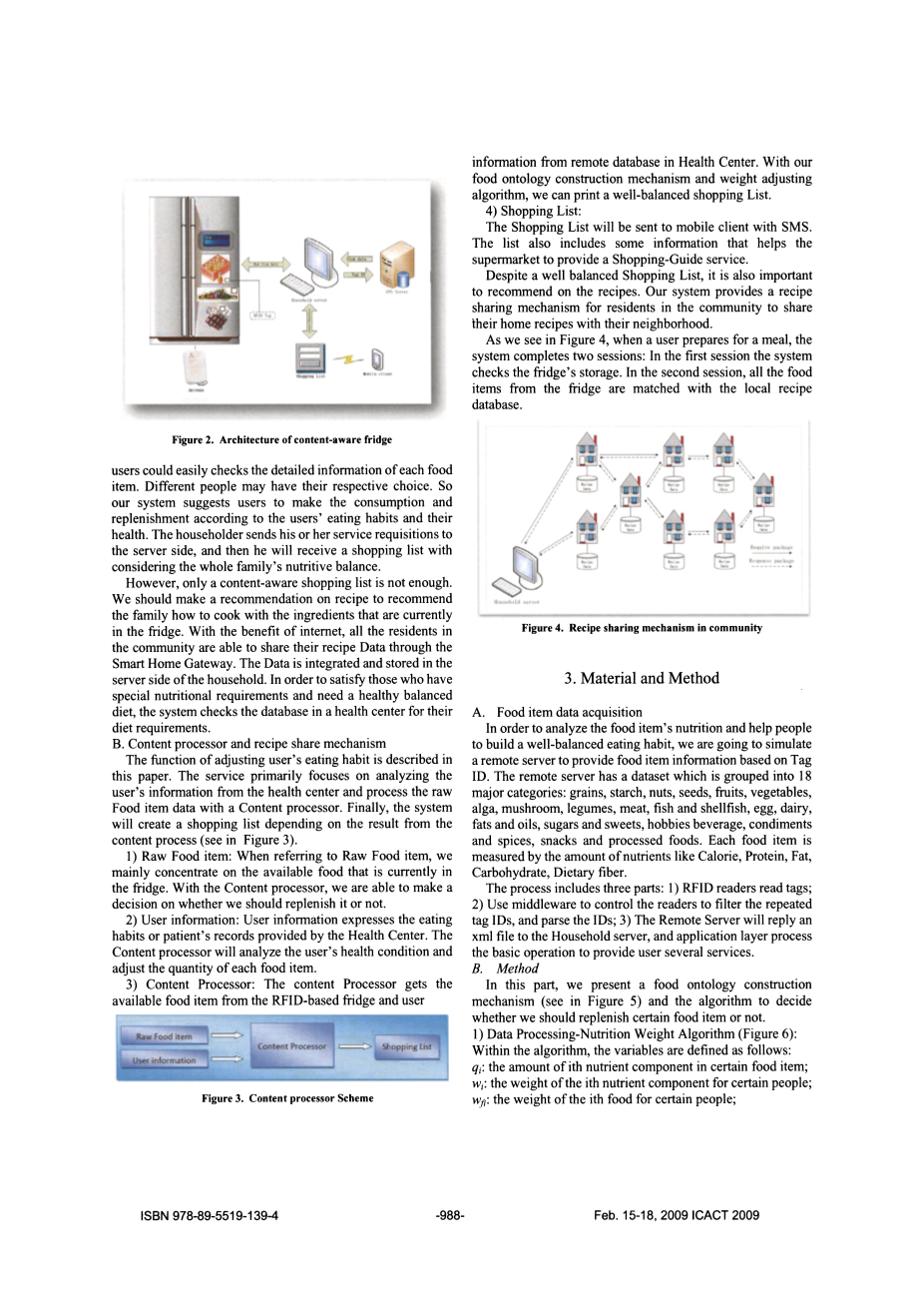 - 内容处理器:内容处理器获取可从基于rfid的冰箱和健康中心的远程数据库获取用户信息。与我们的食品本体构建机制与权重调整算法,我们可以打印一个很平衡的购物清单。