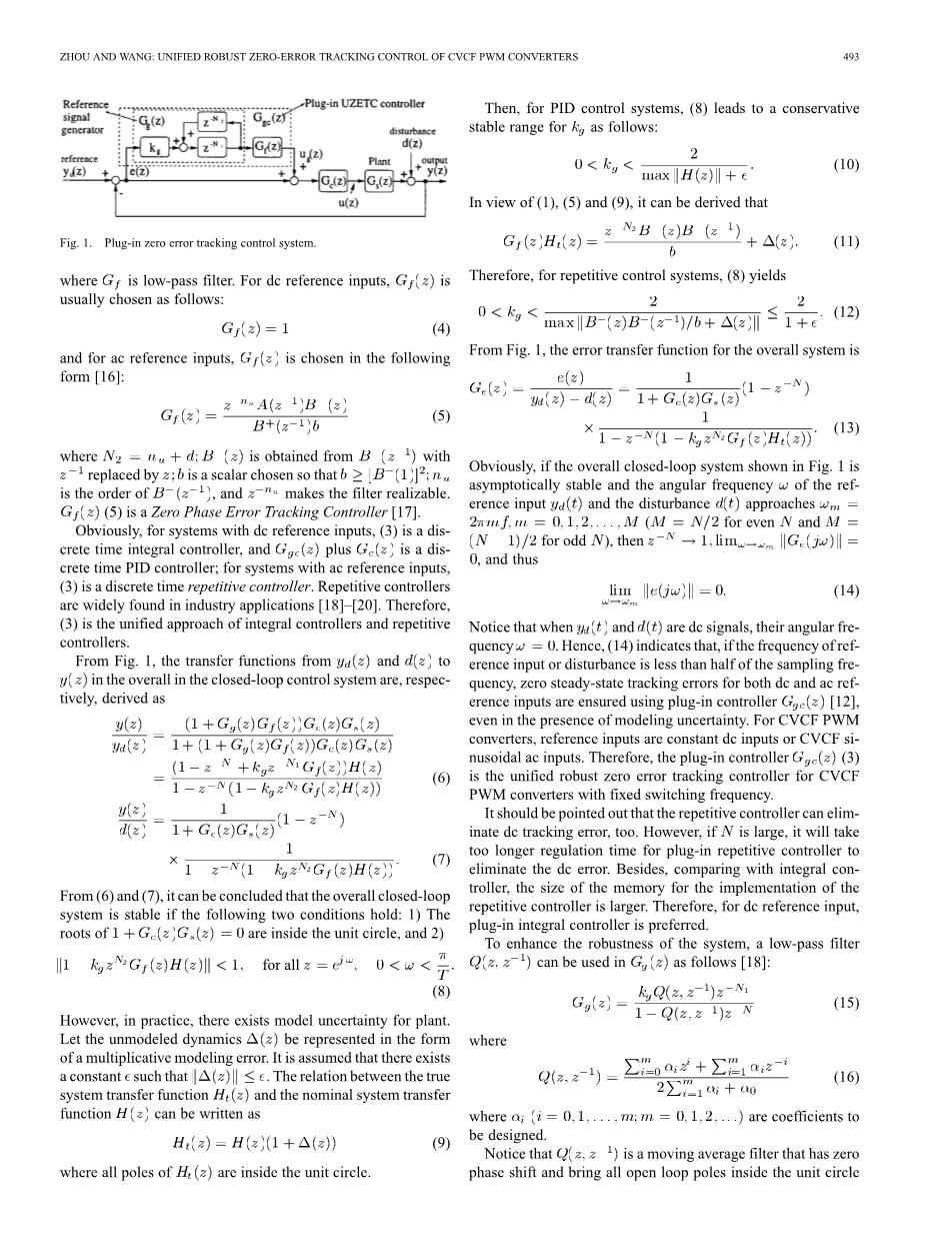 注意,当和是直流信号时,它们的角频率。因此式(14)表明,如果参考输入或扰动的频率小于采样频率的一半,则使用插入式补偿器可以确保直流和交流参考输入的零误差稳态跟踪[12],即使存在建模不确定性的情况也是如此。对于CVCF PWM转换器,其参考输入是恒定直流输入或者CVCF正弦交流输入。因此,式(3)中的插入式补偿器可作为固定开关频率的CVCF PWM变换器的统一鲁棒零误差跟踪控制器。