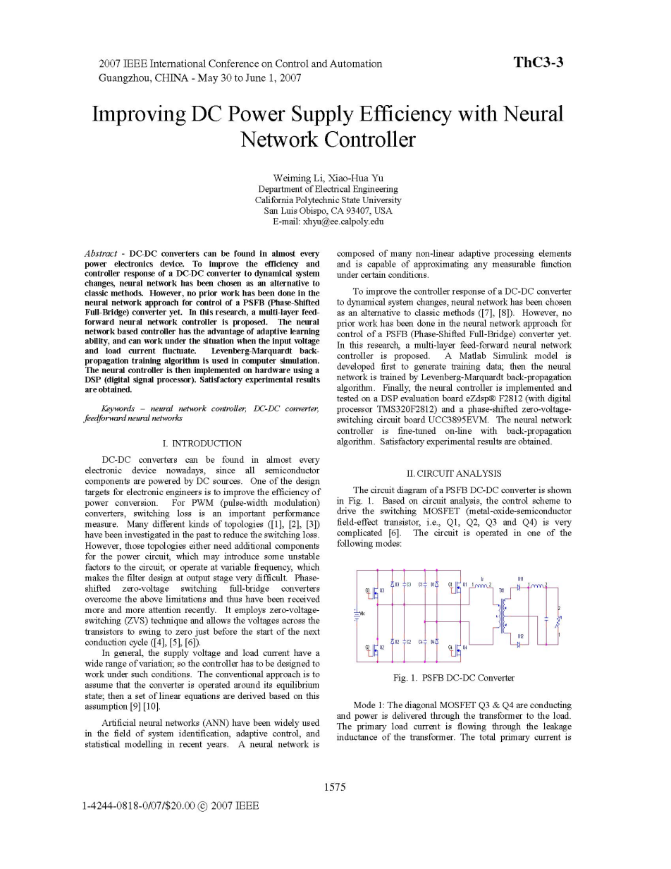 电力电子转换器的根本目的是调节一个电气变量,通常的是输出电压。在许多应用程序中,如可编程直流电源,输出电压将演示一个在接收reference-change命令的几乎理想的响应。这reference-change命令可以是从零到名义值(启动),或从一个操作点到另一个操作点。上升时间的预期要短并且超越要避免过度。然而, 在使用传统的控制方案(如线性控制[1]),一个短的上升时间通常会导致严重的过度。作为时间的函数,直接决定reference-change响应的能力,可以成为在这个应用程序中最重要的部分。