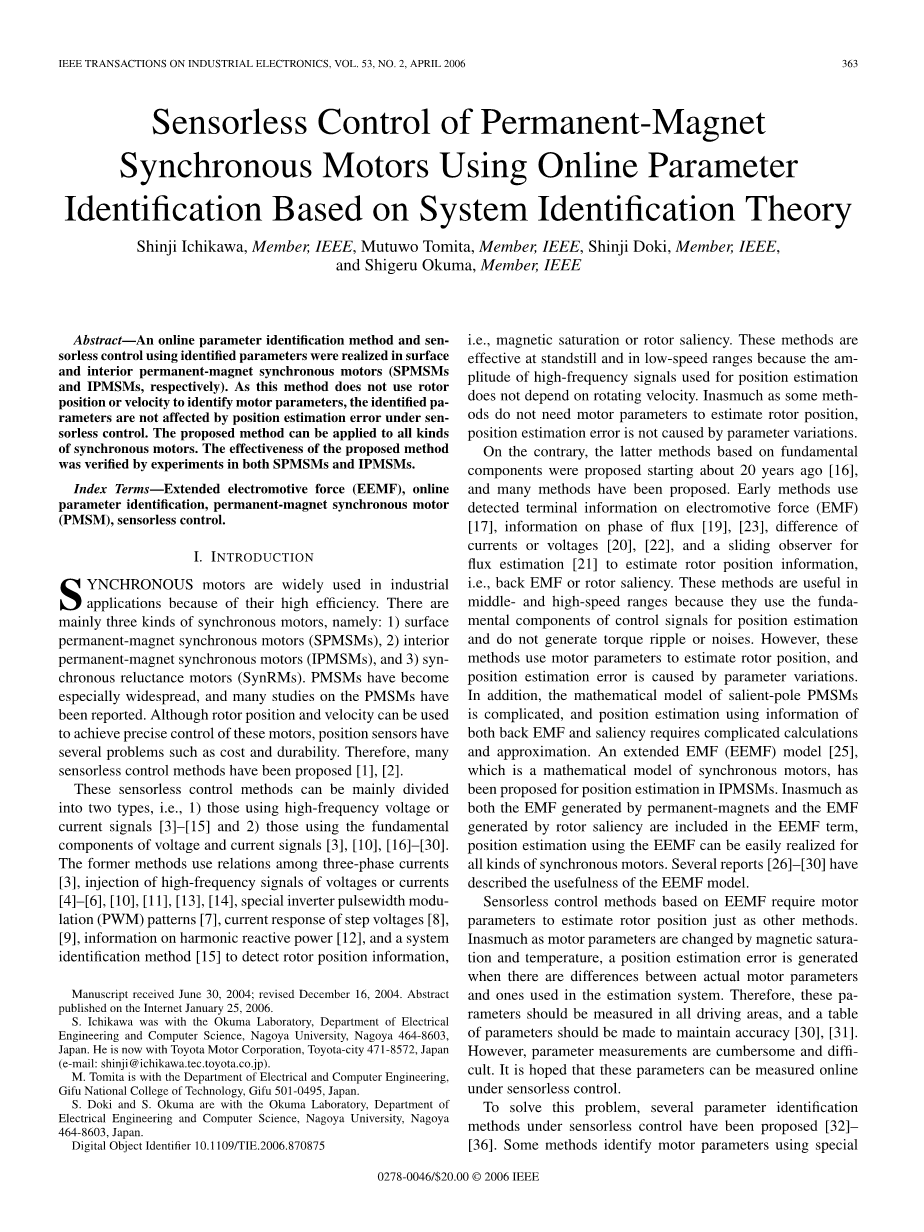 本文组织如下。首先,EEMF定义模型,并在无传感器控制,并是一个严重的问题。其次,提出了一种基于EEMF无传感器控制方法。然后,在线参数辨识方法和参数推导方法,提出了独立于位置和速度。最后,提出无传感器控制系统的有效性验证了实验结果SPMSMs和IPMSMs。