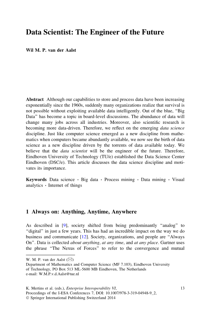 虽然我们的存储和处理数据的能力一直在增加,从20世纪60年代开始,许多组织突然意识到生存是不可能不利用现有的智能数据。不知不觉“大数据”已成为董事会层面讨论的话题。大量的数据将改变许多行业的工作。此外,科学研究也变得更加数据驱动。因此,我们反思新兴的数据科学纪律。就像计算机科学从数学成为一门新学科,学电脑变得丰富时,我们看到数据的诞生,科学作为一门新兴学科,可用的数据洪流驱动的今天。我们相信科学家将是未来的工程师。因此,埃因霍温科技大学(TU/ E)建立埃因霍温(DSC/E)数据科学中心。本文讨论了数据科学学科和激励的重要性。