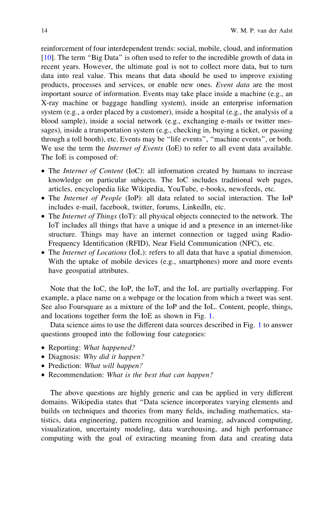 在文献[9]的描述中,社会在短短的几年从“模拟”转移到“数字”。这对我们商务和交流的方式有一个令人难以置信的影响[12]。社会、组织和人“一直在”。数据收集任何东西,在任何时间,任何地方。Gartner词语“Nexus的力量”指的是融合和相互依存的社会,强调四趋势:社会、移动、云、和信息[ 10 ]。“大数据”经常被用来指的惊人增长数据最近几年。然而,最终的目标是不收集更多的数据,但反过来数据转化为真实值。这意味着应该用于改善现有的数据产品、过程和服务,或者启用新的关系。事件数据是最重要的信息来源,事件可能发生在一个机器(如一个x光机或行李处理系统),一个企业内部信息系统(如客户订单),在医院(如血液分析样本),在一个社交网络(如交换电子邮件或twitter信息),在一个交通系统(如检查、买票,或者通过收费站)等等。事件可能是“生活事件”,“机器”事件,或两者兼而有之。我们使用互联网事件的术语(IoE)来指代所有事件数据。