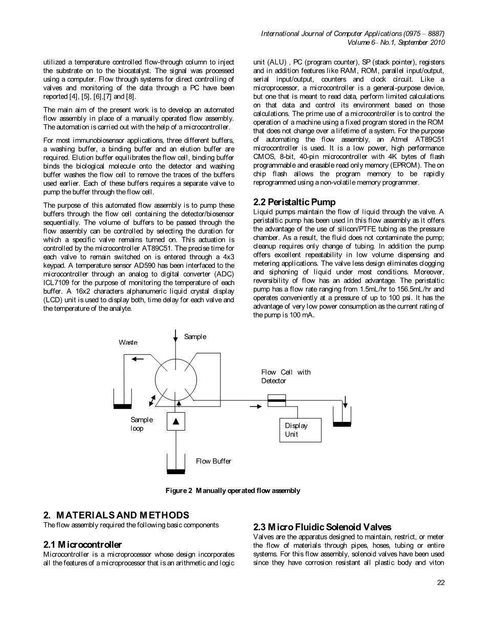 本文研制了一种用于生物传感器的自动流程组件。在最近几年里,连续监测系统在活体生物传感器领域变得越来越热门。因为这种生物相互作用的连续监测,需要自动流程组件的发展来提供技术支持。自动流程组件本质上是以一个耦合的生物传感器形成的一个流动注射分析(FIA)系统。设计流量自动装配由三微流体电磁阀通过AT89C51单片机驱动。每一个阀的开启时间通过一个可由单片机控制的4x3键盘和开关编程控制。此外,用于在线监测的生物传感器的缓冲液温度传感单元通过接口与三维微控制器连接。自动流程组件具备了快速响应的优点。此系统包括基于单片机开发的温度传感器的接口,键盘(用于选择的时间),显示单元(液晶显示器)和电磁阀。