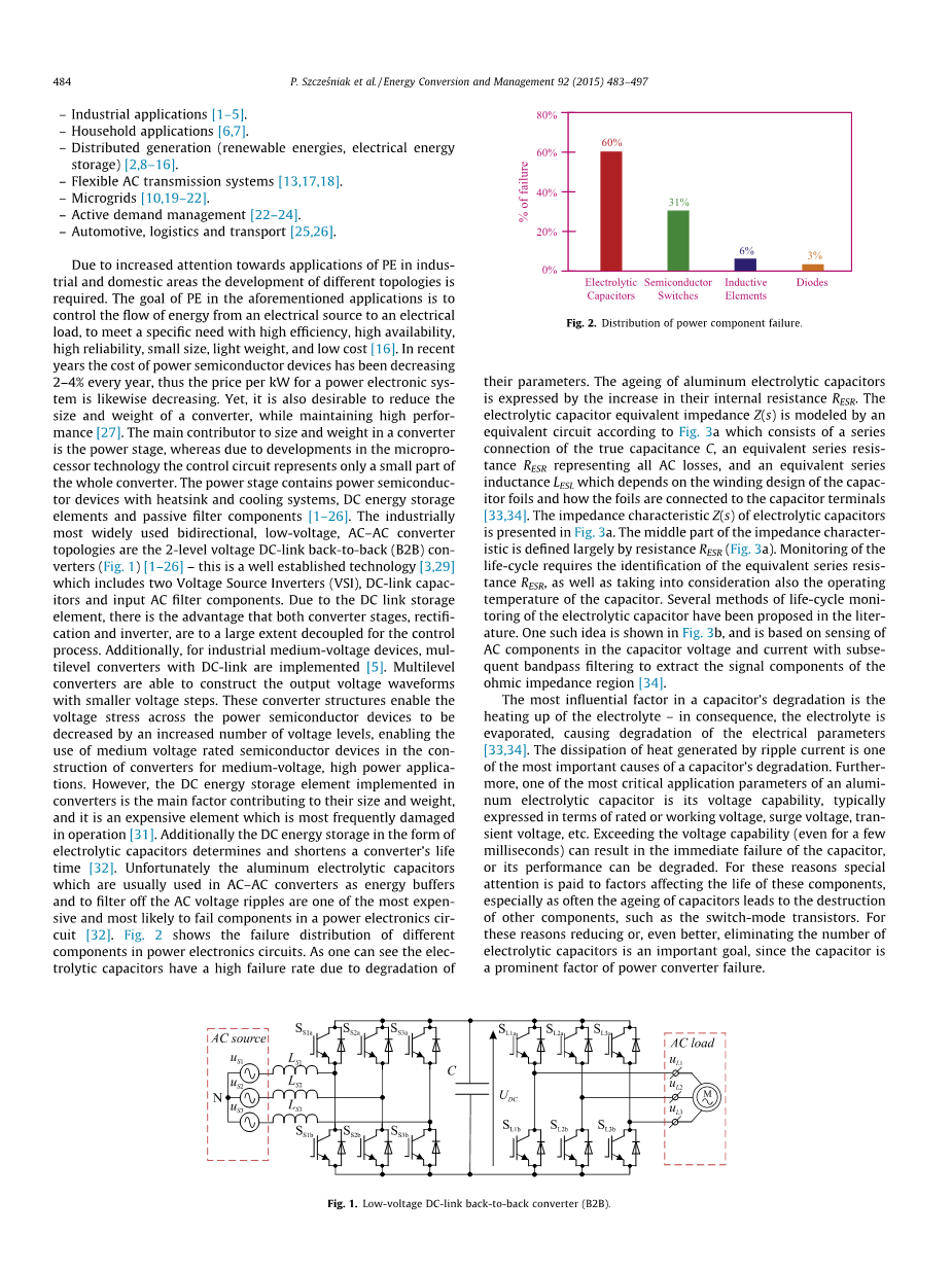 由于在对工业和生活领域的PE的应用增加了需要注意的是不同的拓扑结构的发展。PE在上述应用的目的是,以控制能量从电源流动到电负载,以满足以高效率,高可用性,高可靠性,小尺寸,重量轻,成本低[16特定的需要]。近年来功率半导体器件的成本每年不断减少2-4%,从而每千瓦的价格的电力电子系统同样减少。然而,还期望减小转换器的尺寸和重量,同时保持高的性能[27]。主要贡献者的尺寸和重量在转炉是功率级,而由于在微处理技术的发展,控制电路仅表示整个转换器的一小部分。功率级包含散热器和冷却系统,直流储能元件和无源滤波元件[1-26]功率半导体器件。在工业上最广泛使用的双向的,低电压,AC-AC转换器的拓扑结构是2-级电压DC链路后端到背面(B2B)的转换器(图1)[1-26] - 这是一个完善的技术[3,29],它包括两个电压源逆变器(VSI),直流母线电容和交流输入滤波元件。由于DC链路存储元件,存在的优点是,两个转换器的阶段,整流和逆变器,是解耦的控制处理的大的程度。此外,对于工业中压装置,具有直流环节多电平变换器来实现[5]。多电平转换器是能够与较小的电压的步骤来构造输出电压波形。这些转换器的结构使跨功率半导体器件上的电压应力,以由电压电平的数量增加减小,从而使在转换为中压,高功率应用的结构中使用的中压额定半导体器件。然而,在转换器中实现的DC能量储存元件是有助于它们的尺寸和重量的主要因素,而且它是一种昂贵的元件,其在操作[31]过程中容易频繁损坏。此外DC蓄能在电解电容器的形式确定并且缩短一个转换器寿命[32]。不幸的是其通常在交流 - 交流转换器用作能量缓冲器和以滤出的交流电压波动的铝电解电容器是在功率电子电路[32]的最昂贵和最有可能失败的组件之一。 图。2显示了不同组件的电力电子电路故障分布。如我们可以看到的电解电容器具有高失败率,由于它们的参数的降解。铝电解电容器的老化是由在其内部电阻的REST的增加表示。电解电容器等效阻抗Z(s)是通过根据图1中的等效电路进行建模。图3a它由真实电容C的串联连接,代表所有AC损耗的等效串联电阻ESR,以及依赖于电容器箔的卷绕设计和等效串联电感LESL的箔是如何连接到电容器端子33,34]。电解电容器的阻抗特性Z(S)示于图3A。阻抗特性的中间部分主要是由电阻REAR(图3a)中所定义。生命周期的监测需要的等效串联电阻测试的鉴定,以及考虑到也电容器的操作温度。电解电容器的寿命周期监测几种方法已在文献中被提出。一个这样的想法是示于图3b和基于在所述电容器电压的AC分量的感测,并与随后的带通滤波来提取所述欧姆阻抗区域[34]的信号成分的电流。在电容器降解影响最大的因素是电解质的升温 - 在后果,电解质被蒸发,从而引起电参数[33,34]的劣化。由纹波电流产生的热量的消散是一个电容器的退化的最重要原因之一。此外,铝电解电容的最关键的应用的参数之一是它的电压能力,典型地在超过电压能力(甚至为几毫秒)额定或工作电压,浪涌电压,瞬态电压等来表达可导致在电容器,或它的性能的直接故障可以被降解。由于这些原因,特别注意的是,以影响这些部件的寿命的因素,特别是作为常电容器的老化导致其它部件,如开关式晶体管的破坏。由于这些原因减少,或者甚至更好,消除电解电容器的数量是一个重要的目标,因为电容器是功率转换器故障的一个突出的因素。