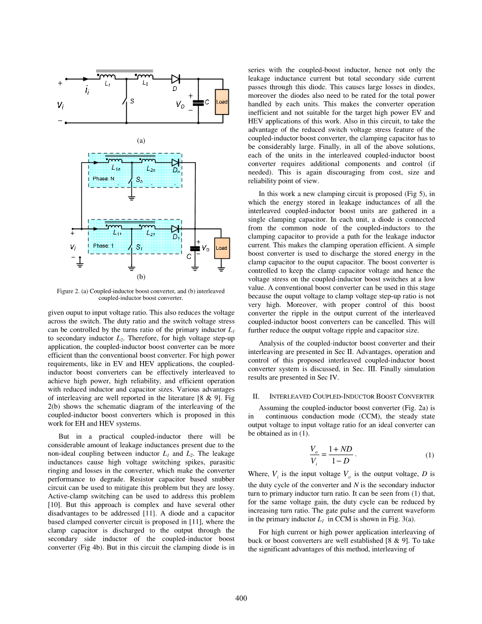 假设耦合电感升压变换器(图2a)是在连续导通模式(CCM),可以如在得到的稳态输出电压与输入电压比的理想的转换器如公式1。