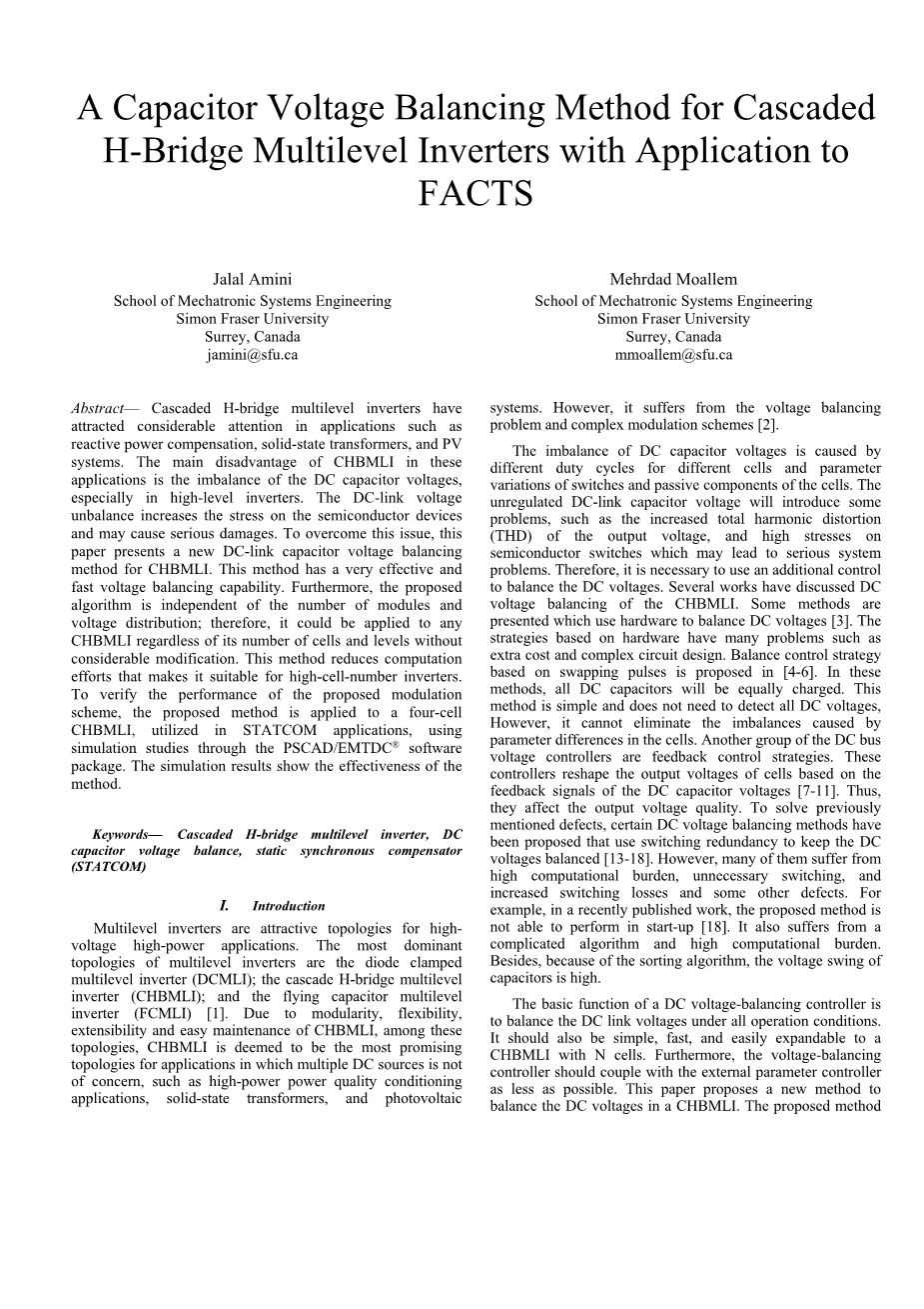 应用于柔性交流输电系统H桥级联多电平逆变器的电容电压平衡方法外文翻译资料