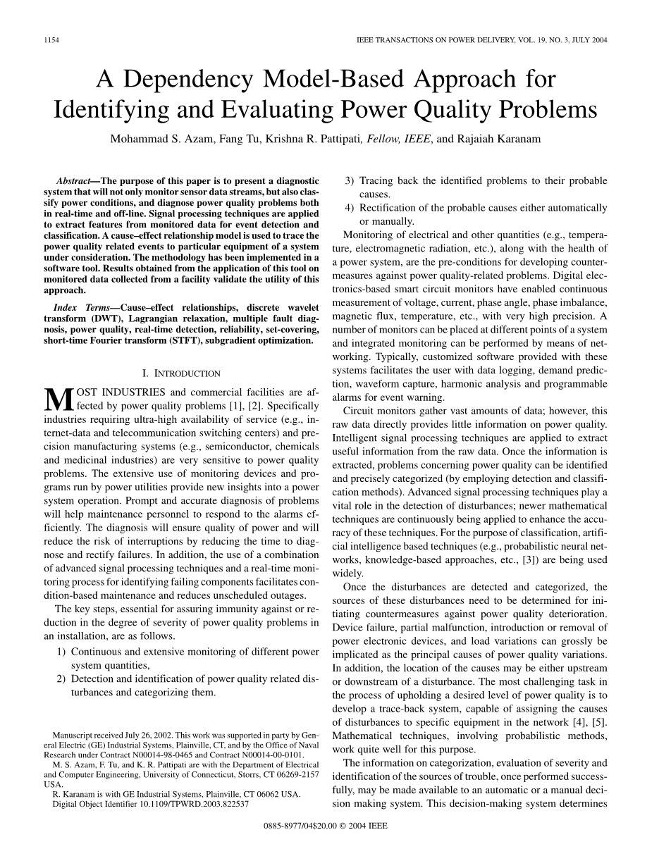 关键词:因果关系,离散小波变换,拉格朗日松弛算法,多故障诊断,电能质量,实时监测,可靠性,节能覆盖,短时距傅里叶变换,次梯度优化