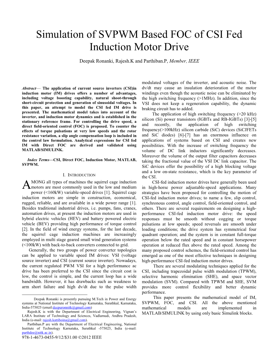 本文提出了IM的数学模型,SVPWM,FOC和CSI。 上面提到的所有数学模型在中实现