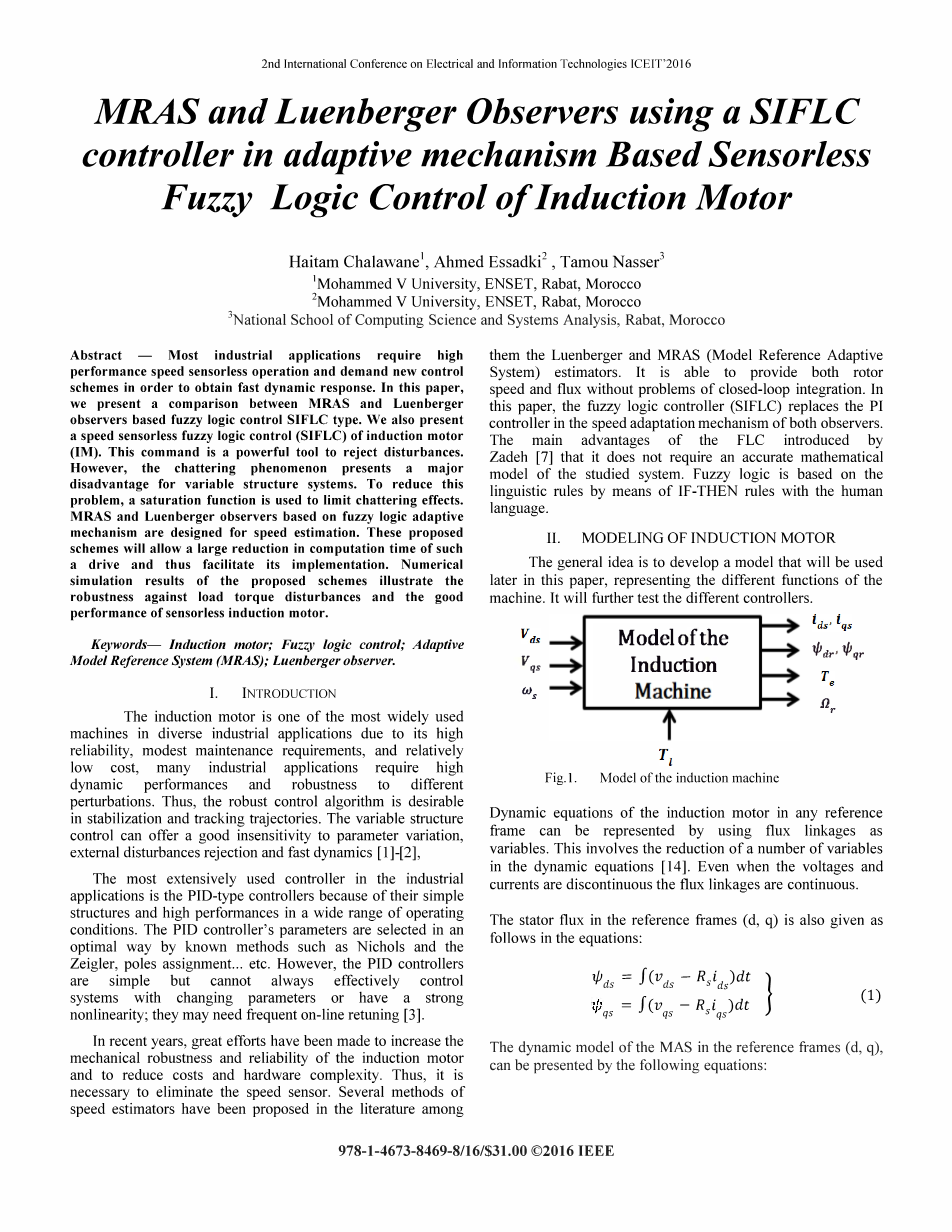 关键词:感应电机; 模糊逻辑控制; 自适应模型参考系统(MRAS); 龙贝格观测器。