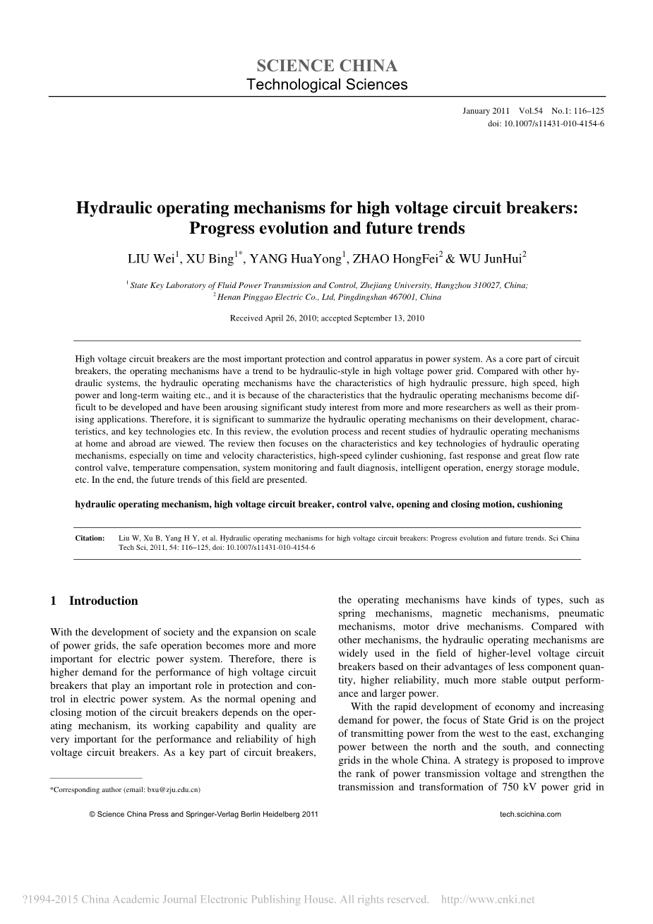 关键词:液压操作机构,高压断路器,控制阀,开闭运动,缓冲