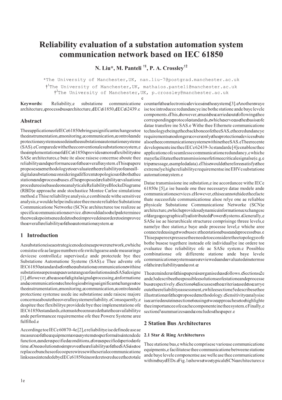 关键词:可靠性,变电站通信架构,过程总线架构,IEC 61850,IEC 62439。