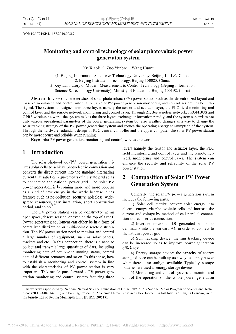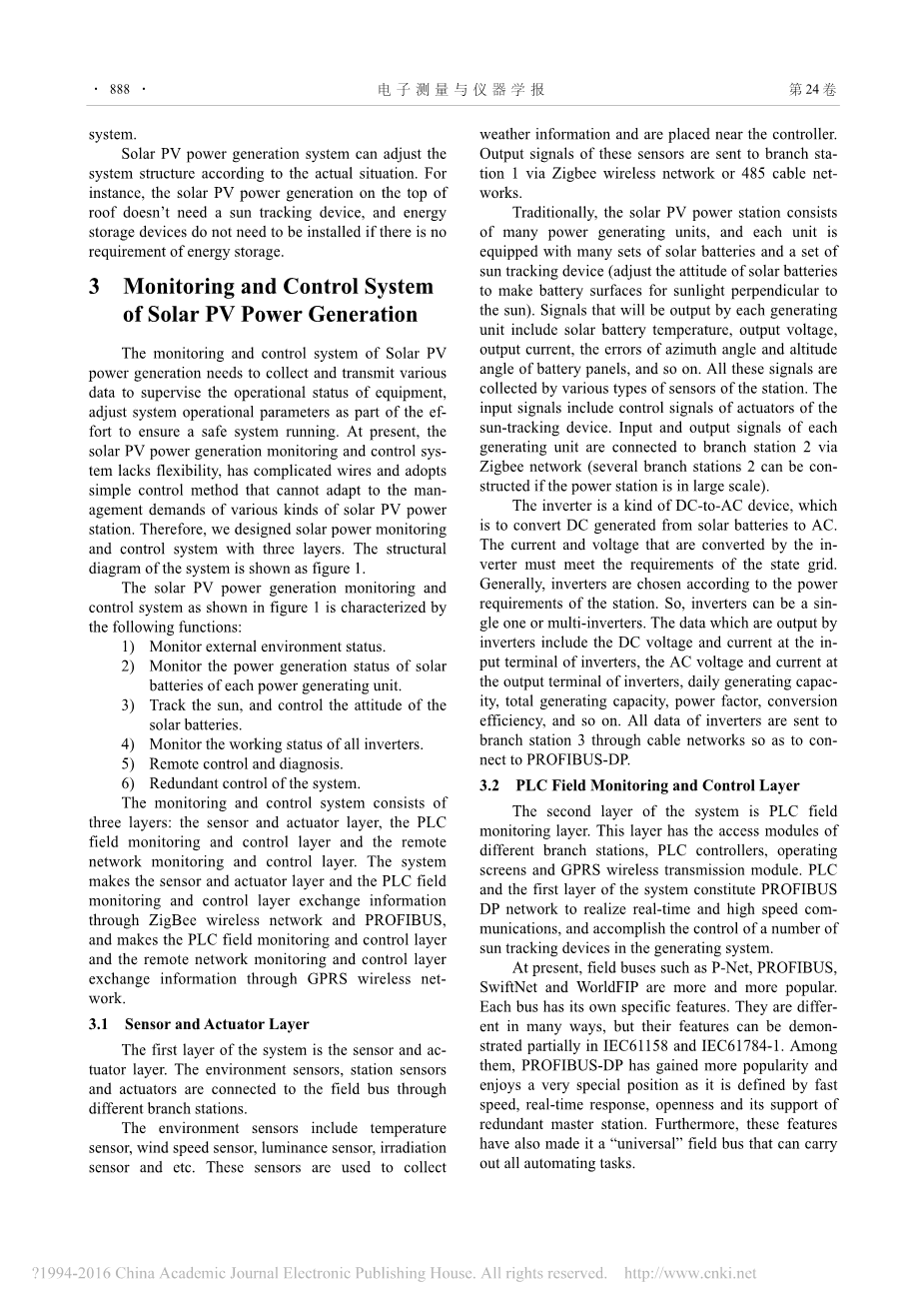 该太阳能光伏发电监视和控制系统被设计为具有传感器和执行器层,PLC现场监视和控制层,以及远程网络监视和控制层这三个层面。该系统通过ZigBee无线网络和PROFIBUS使传感器和执行器层和PLC现场监控层进行信息交换,该系统还通过GPRS无线网络使PLC现场监视和控制层与远程网络监视和控制层进行信息交换。该系统能够灵活设置,适应各种地理条件、气象条件及发电规模的变化,并且,该系统可以对光伏电站进行现场和远程监控,从而确保了光伏发电系统的安全运行。